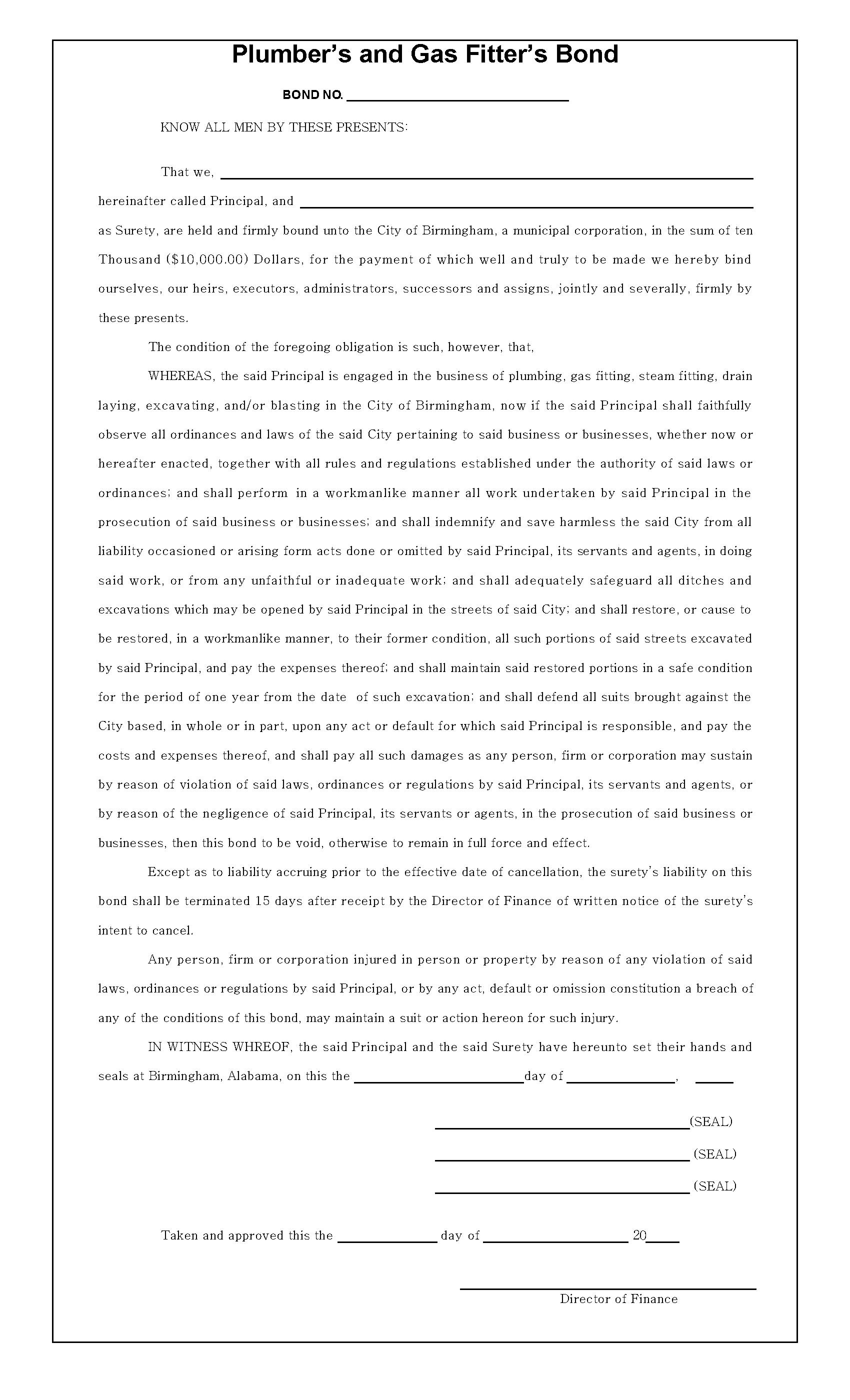 The Alabama City of Birmingham Plumber's and Gas Fitter's Bond starts at $100 plus shipping costs and fees. Fill out the form to buy your bond instantly!