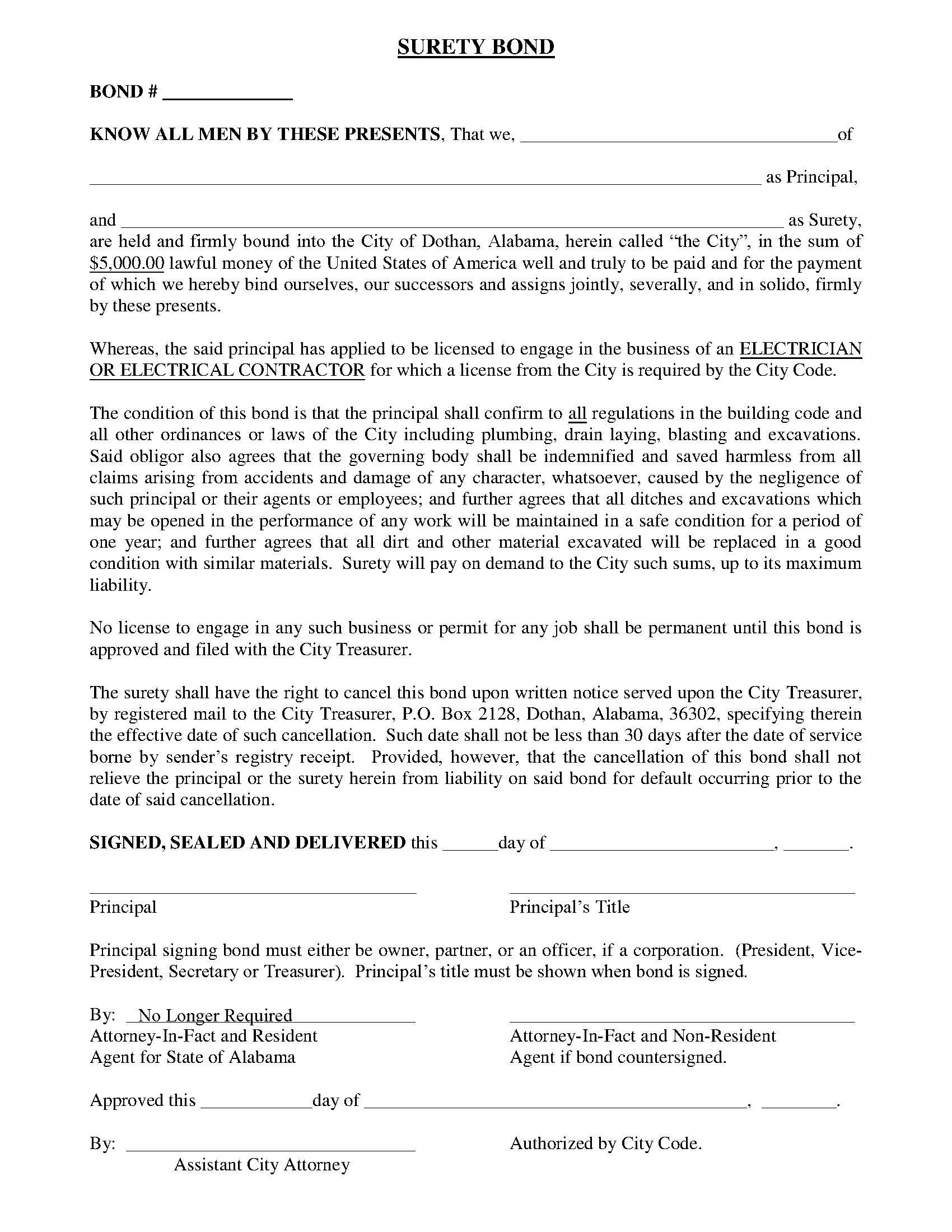 The Alabama City of Dothan Electrician/Electrical Contractor Bond starts at $100 plus shipping costs and fees. Fill out the form to buy your bond instantly!