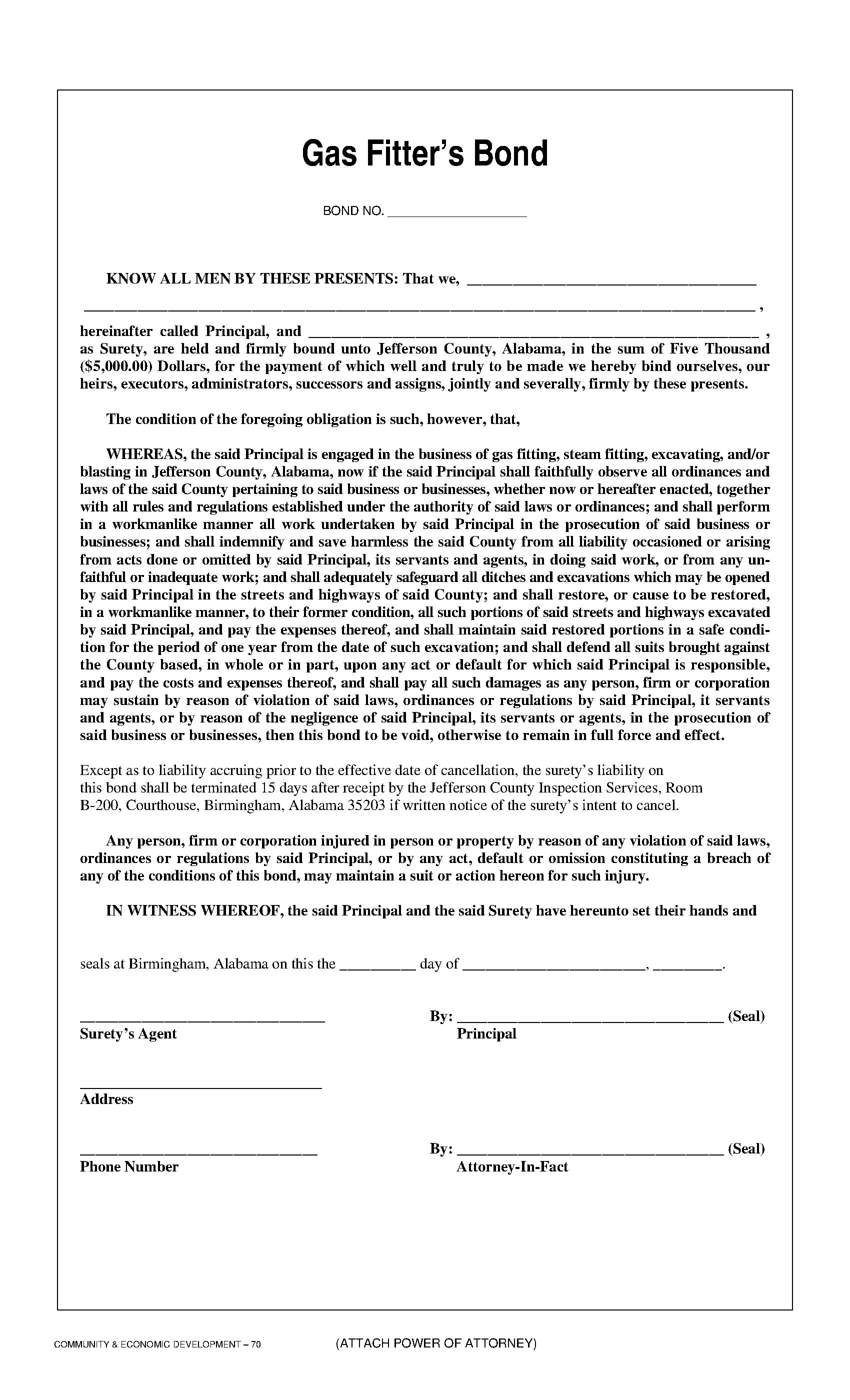 The Alabama Jefferson County Gas Fitter Bond starts at $100 plus shipping costs and fees. Fill out the form to buy your bond instantly!