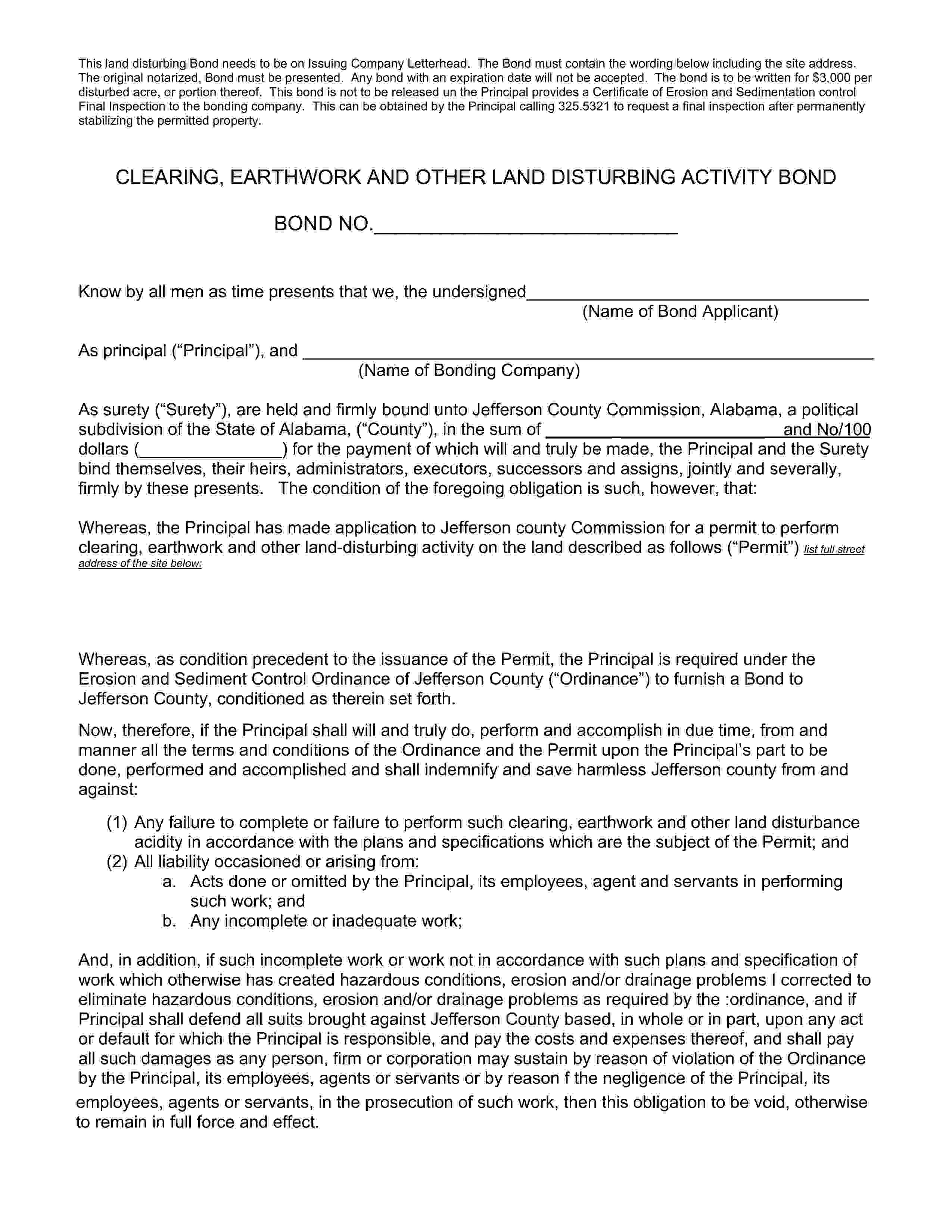 The Alabama Jefferson County Commission Jefferson - County Land Disturbing Bond starts at $100 plus shipping costs and fees. Fill out the form to buy your bond instantly!