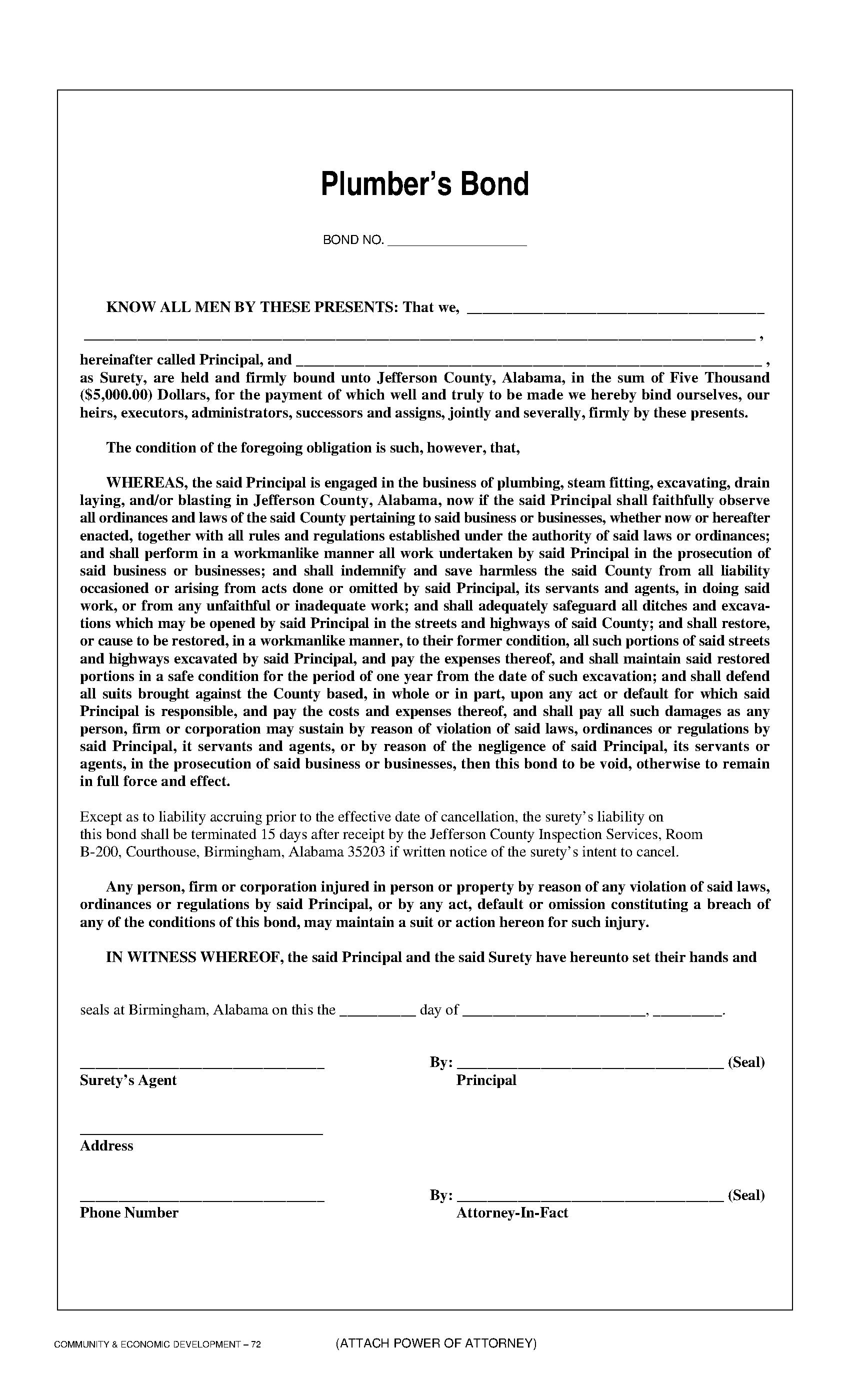 The Alabama Jefferson County Plumber's Bond starts at $100 plus shipping costs and fees. Fill out the form to buy your bond instantly!