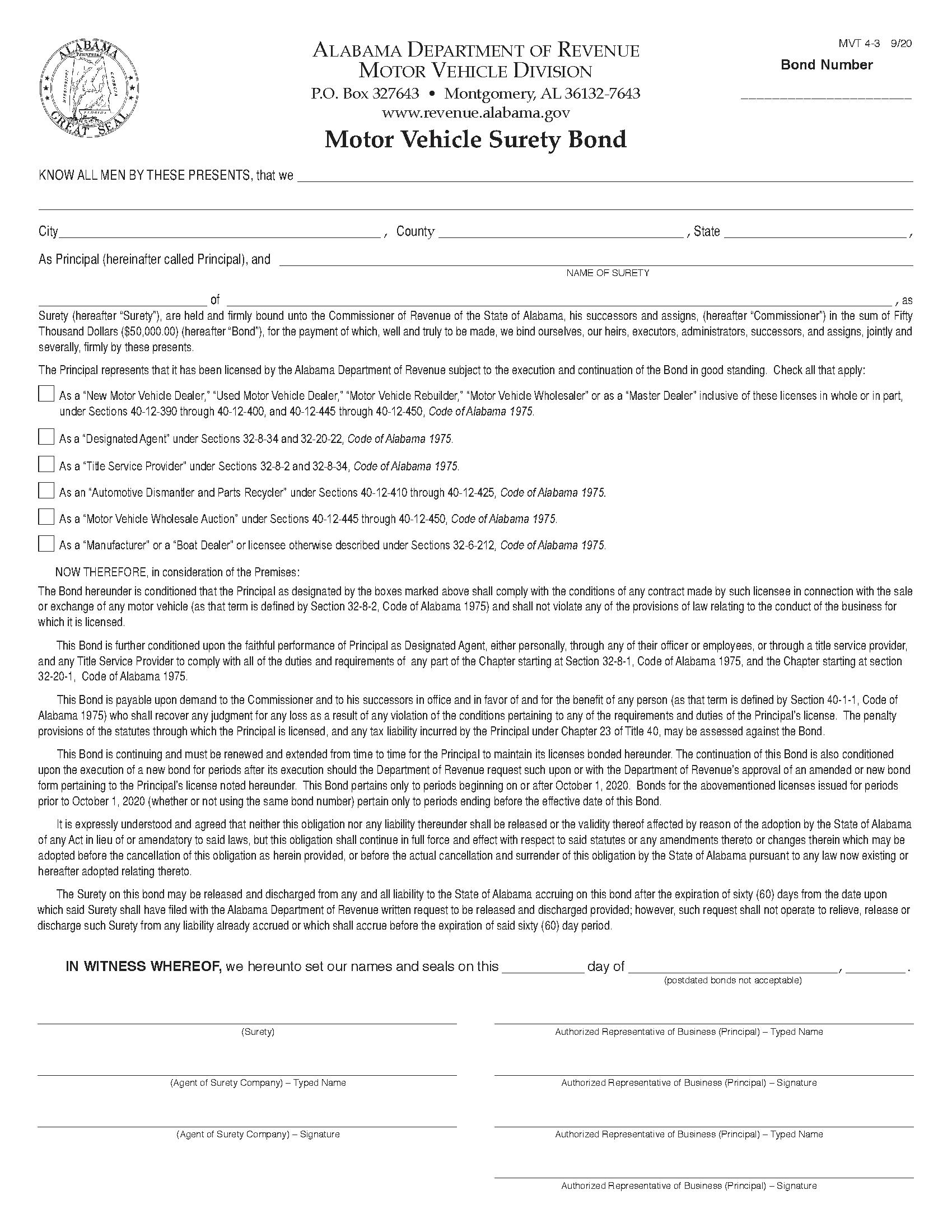 In 2020, Alabama discontinued the individual licenses for motor vehicle dealers, wholesalers, reconditioners, and rebuilders and replaced them with a singular “Master Dealer” License. With the new license came an updated surety bond requirement, with a new bond amount of $50,000.