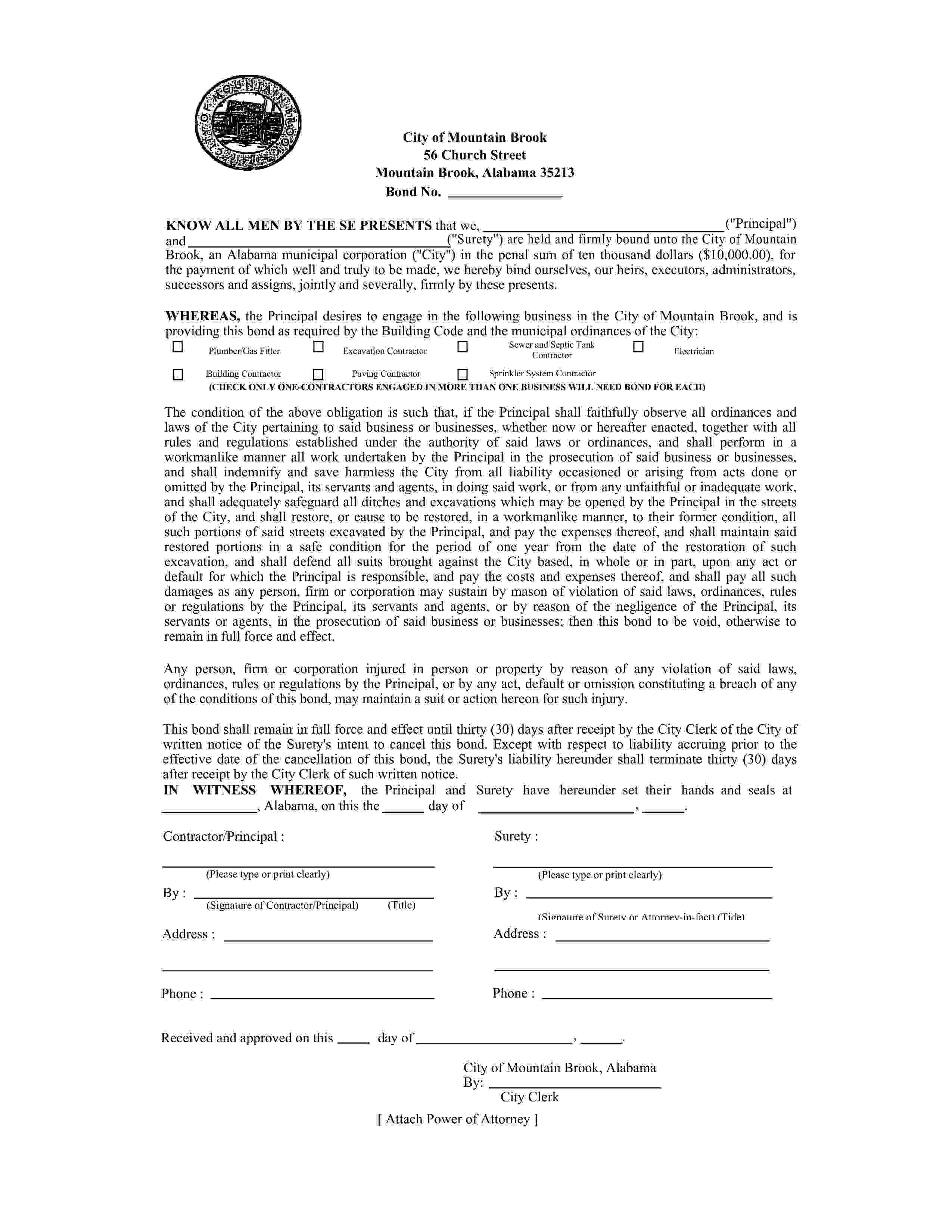 City of Mountain Brook Mountain Brook - City Plumber/Gas Fitter Bond