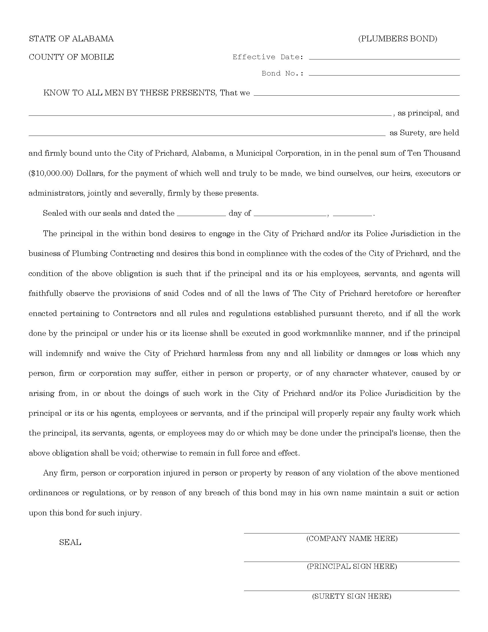 The Alabama City of Prichard Plumbing Contractor License Bond starts at $100 plus shipping costs and fees. Fill out the form to buy your bond instantly!