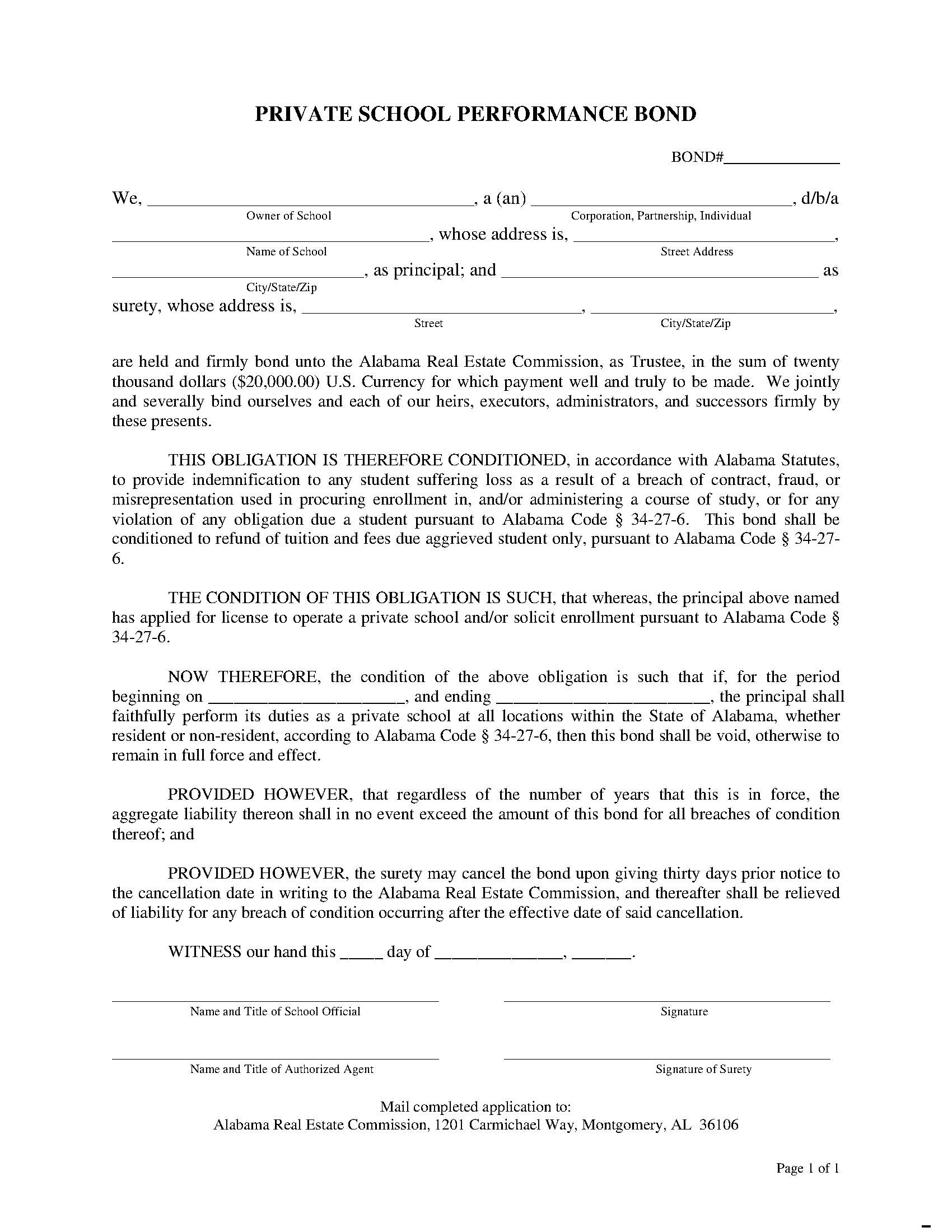 The Alabama Private School Performance (Real Estate School) Bond starts at $200 plus shipping costs and fees. Fill out the form to buy your bond instantly!