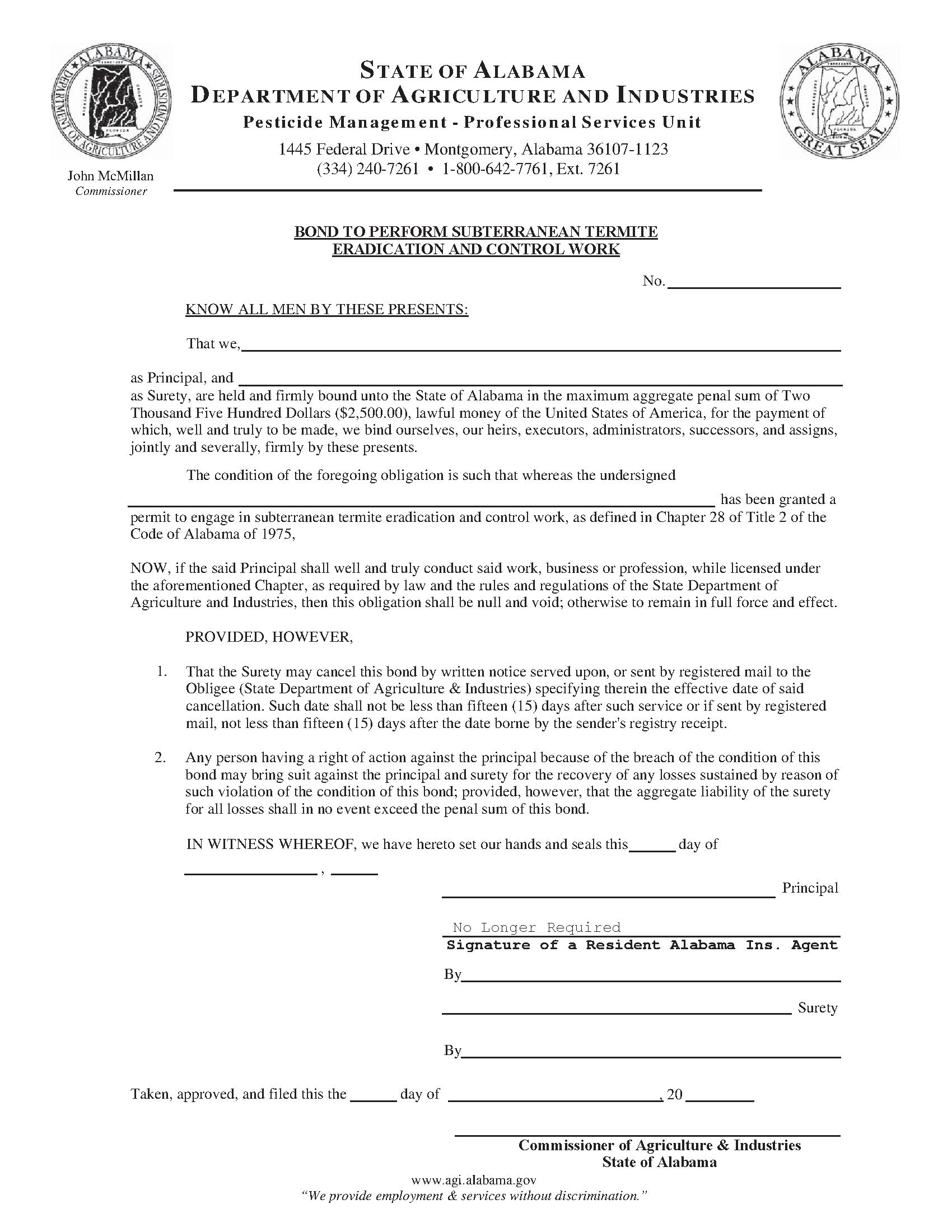 State of Alabama Subterranean Termite Eradication and Control Work Bond