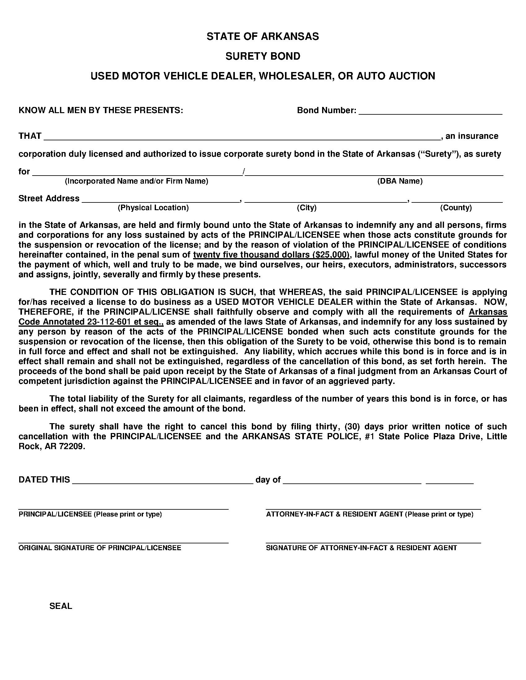 State of Arkansas Used Motor Vehicle Dealer, Wholesaler, or Auto Auction Bond