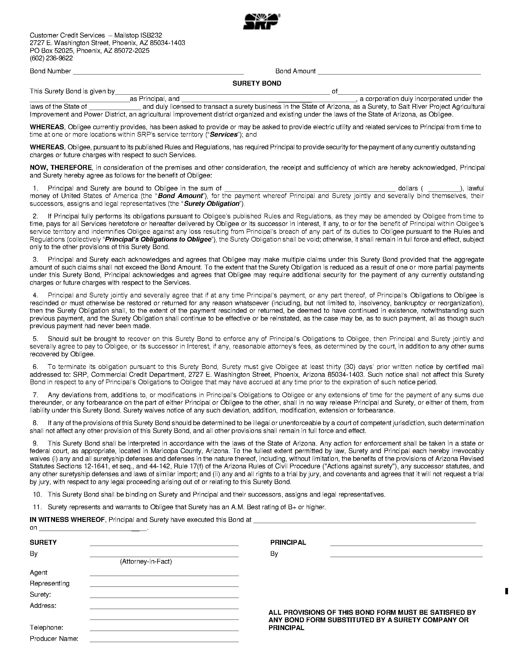The Salt River Project Agricultural Improvement and Power District Utility Deposit Bond starts at $100 plus shipping costs and fees. Fill out the form to buy your bond instantly!