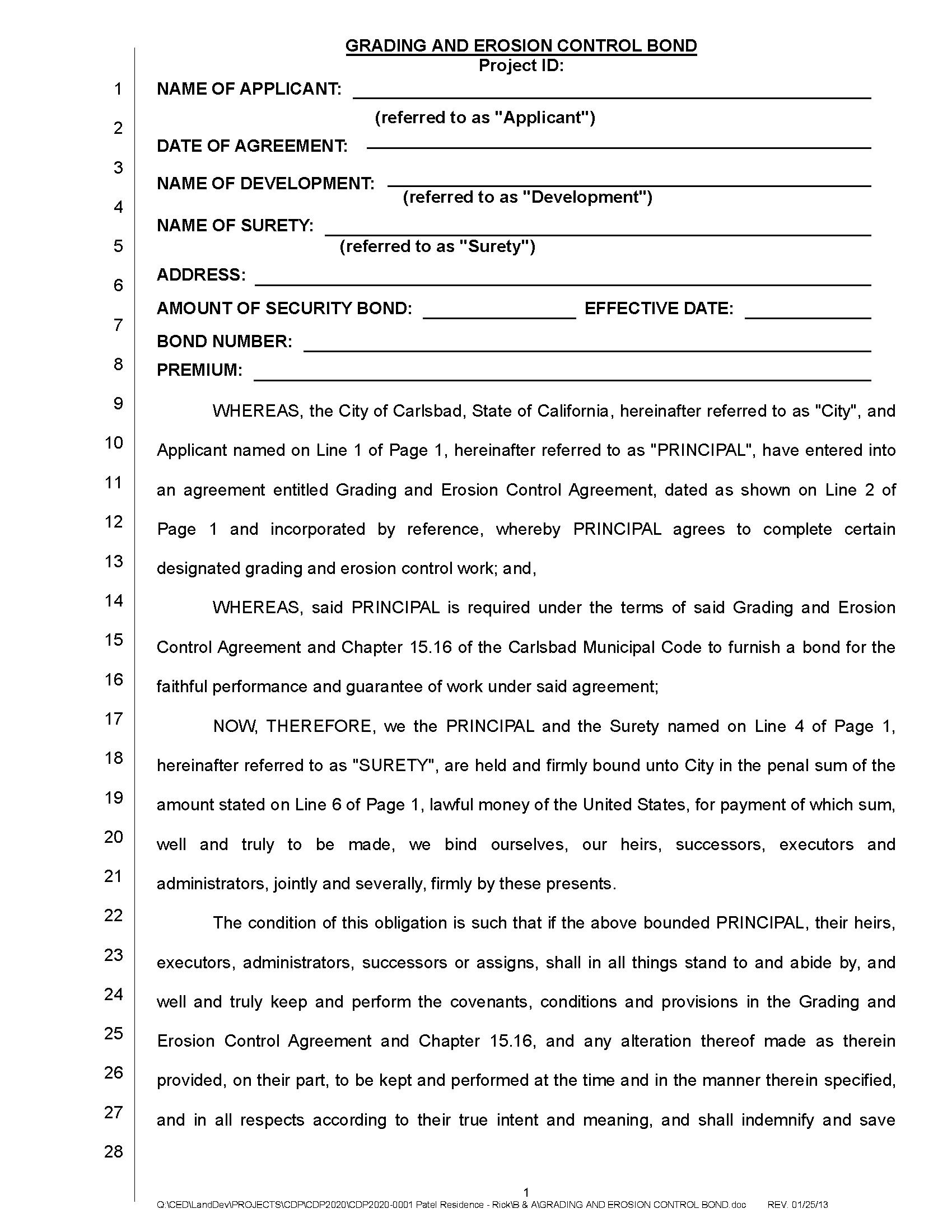 The California City of Carlsbad Grading and Erosion Control Bond starts at $100 plus shipping costs and fees. Fill out the form to buy your bond instantly!