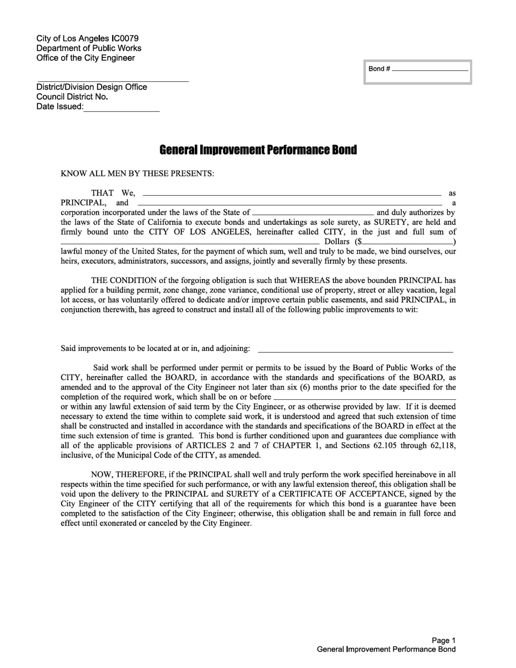 City of Los Angeles General Improvement Performance Bond