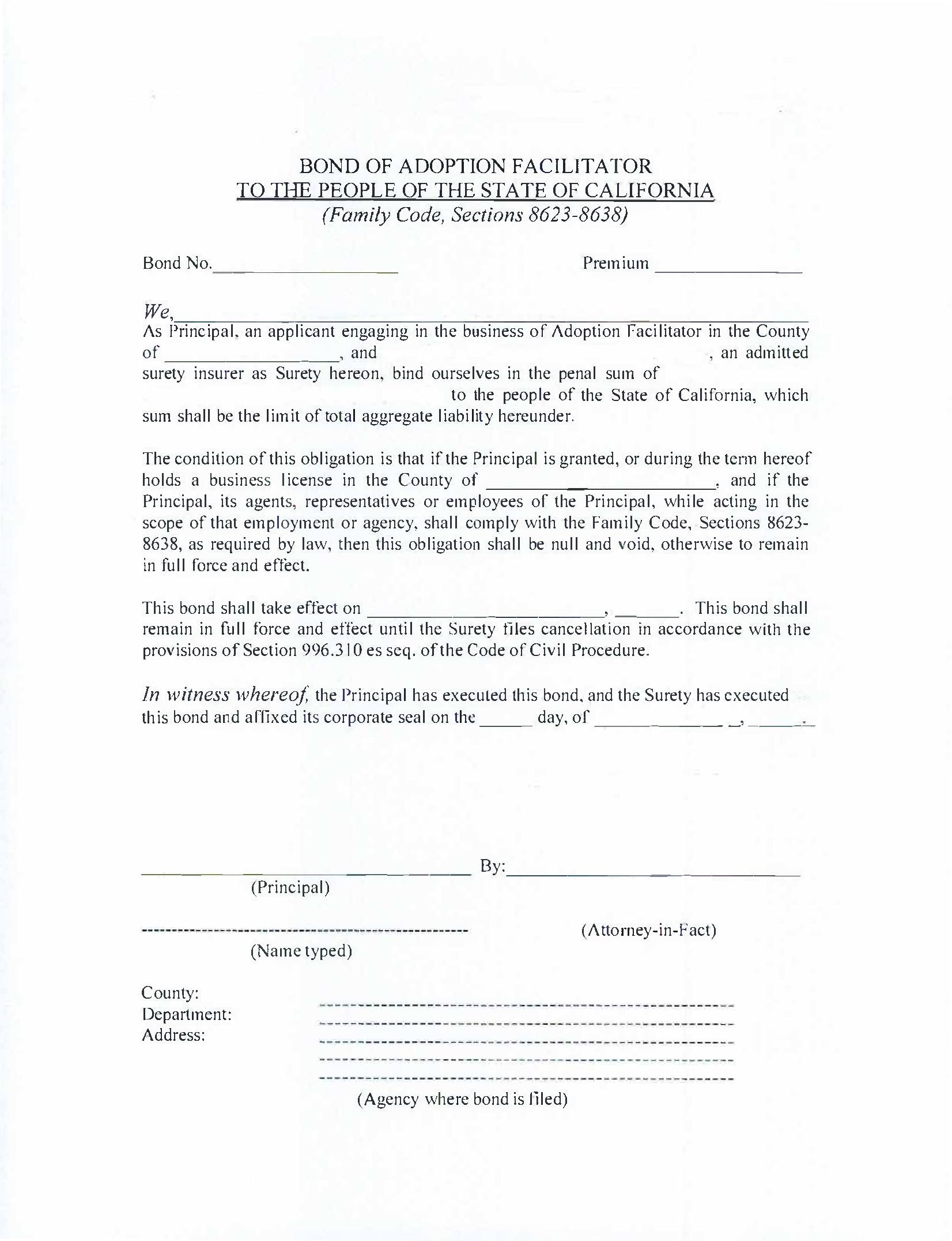 The California Adoption Facilitator Bond starts at $250 plus shipping costs and fees. Fill out the form to buy your bond instantly!