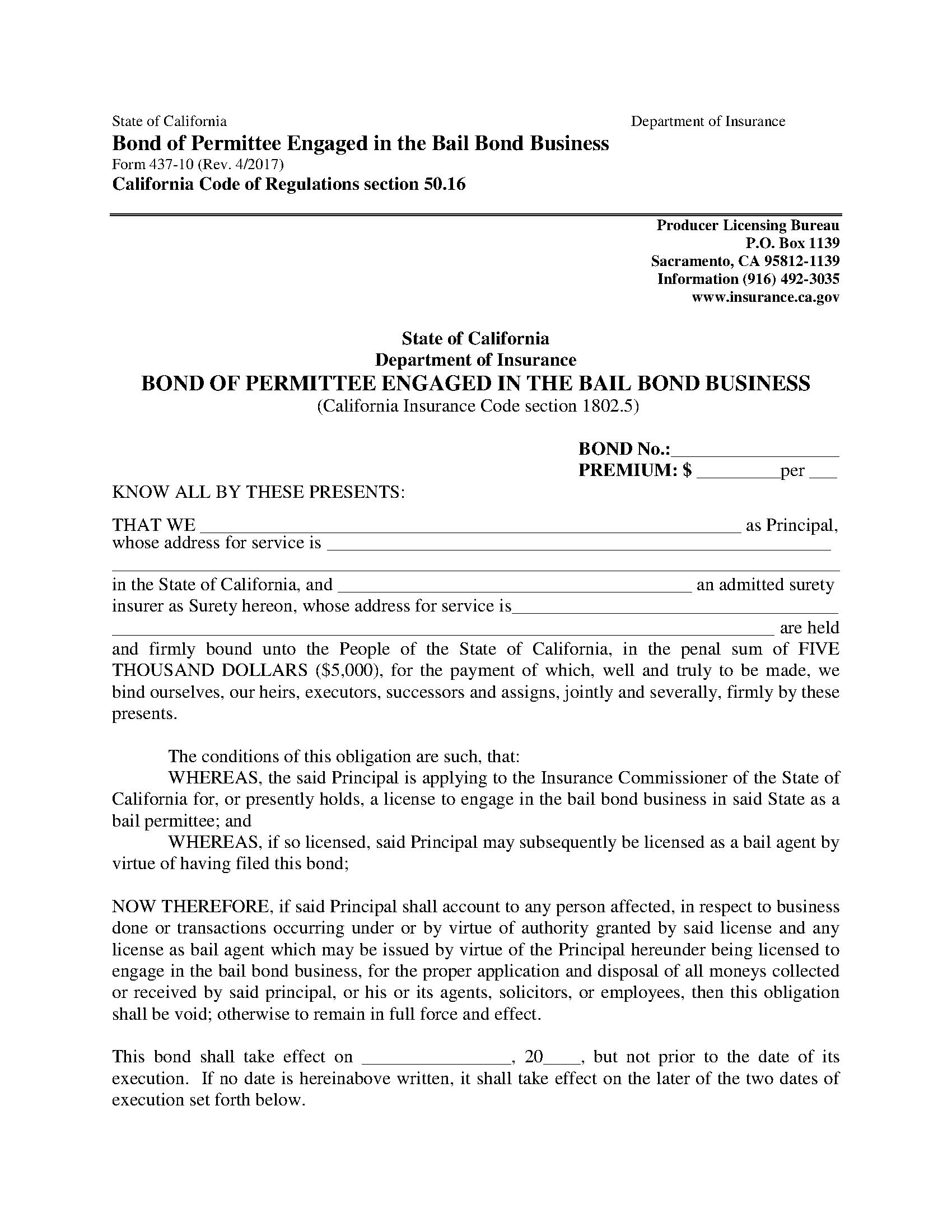 The California Bail Bond Permittee Bond starts at $100 plus shipping costs and fees. Fill out the form to buy your bond instantly!
