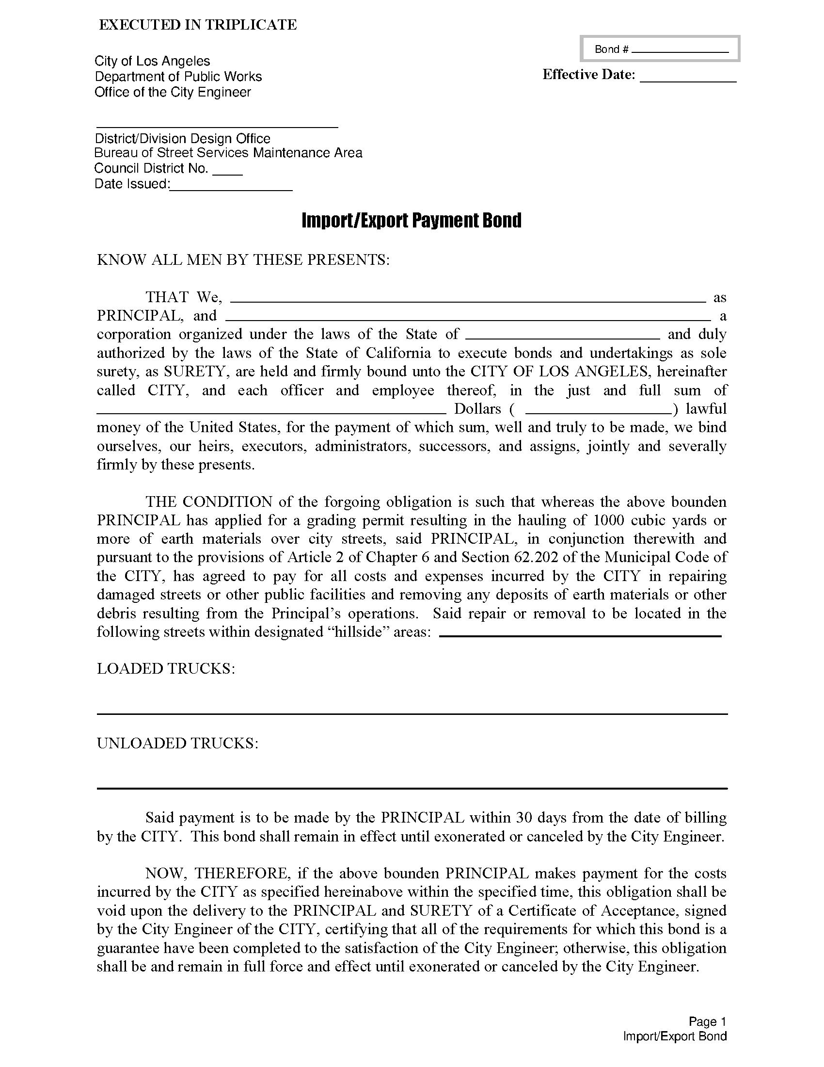 The California City of Los Angeles ROW / Import-Export Payment Bond starts at $100 plus shipping costs and fees. Fill out the form to buy your bond instantly!