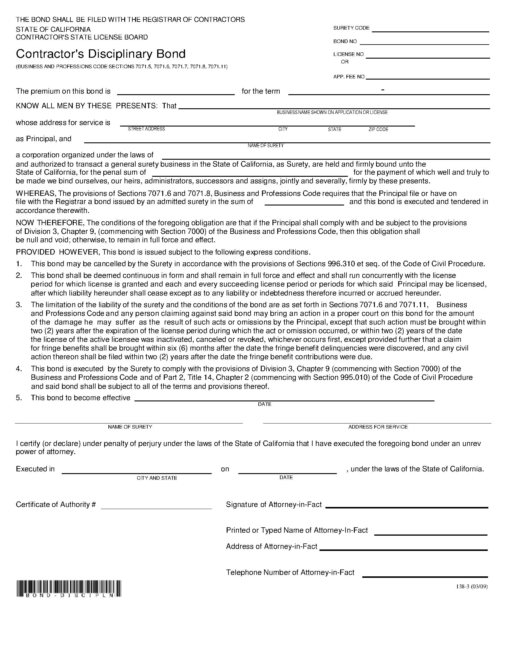 State of California, Contractors State License Board Contractor's Disciplinary Bond