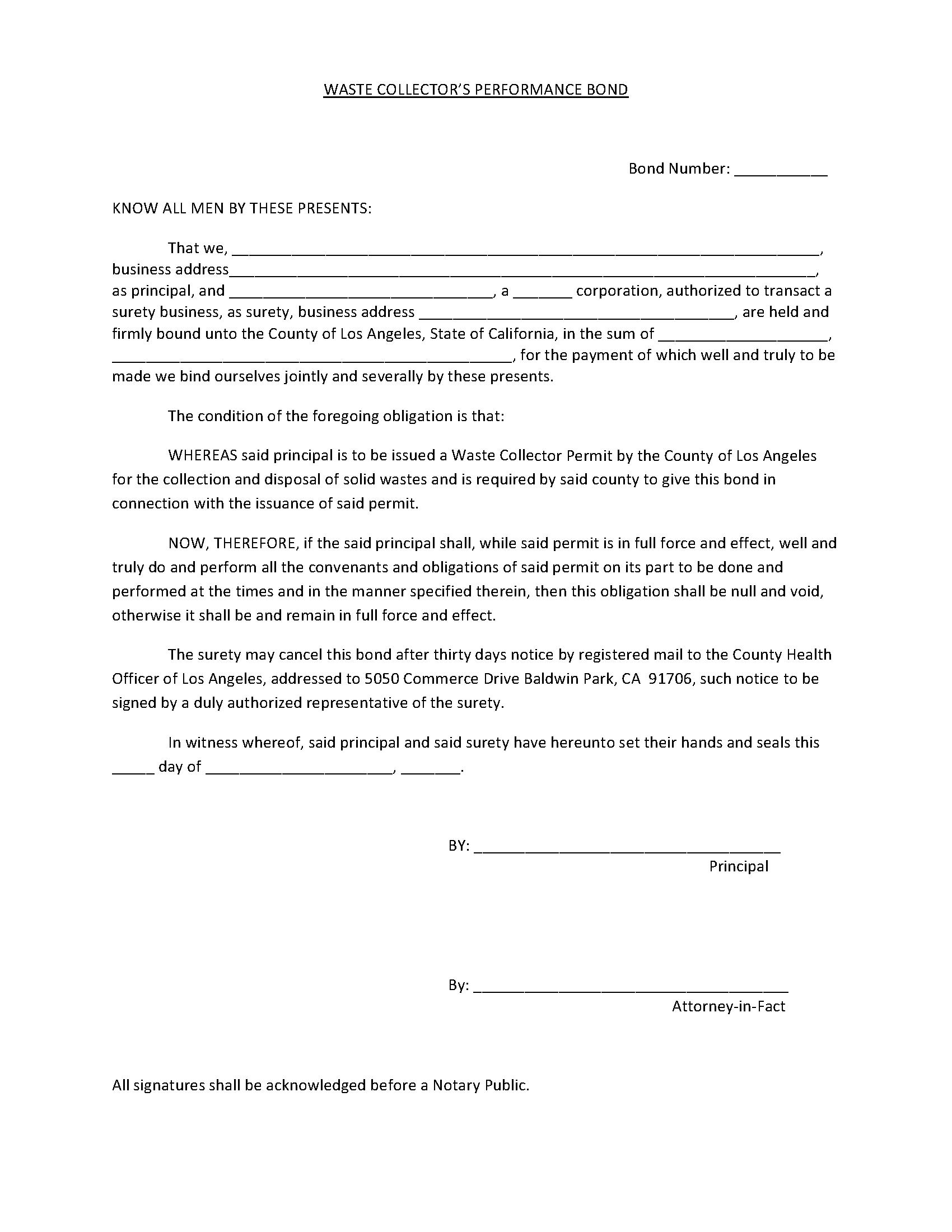 The California Los Angeles County Waste Collector's Performance Bond starts at $100 plus shipping costs and fees. Fill out the form to buy your bond instantly!
