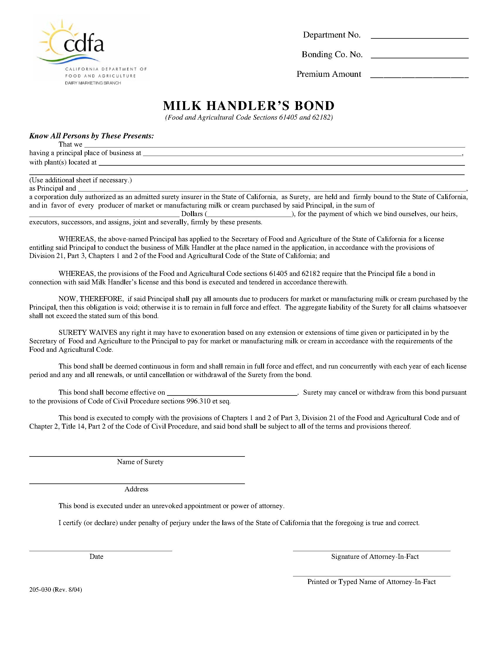 State of California Milk Handler Bond