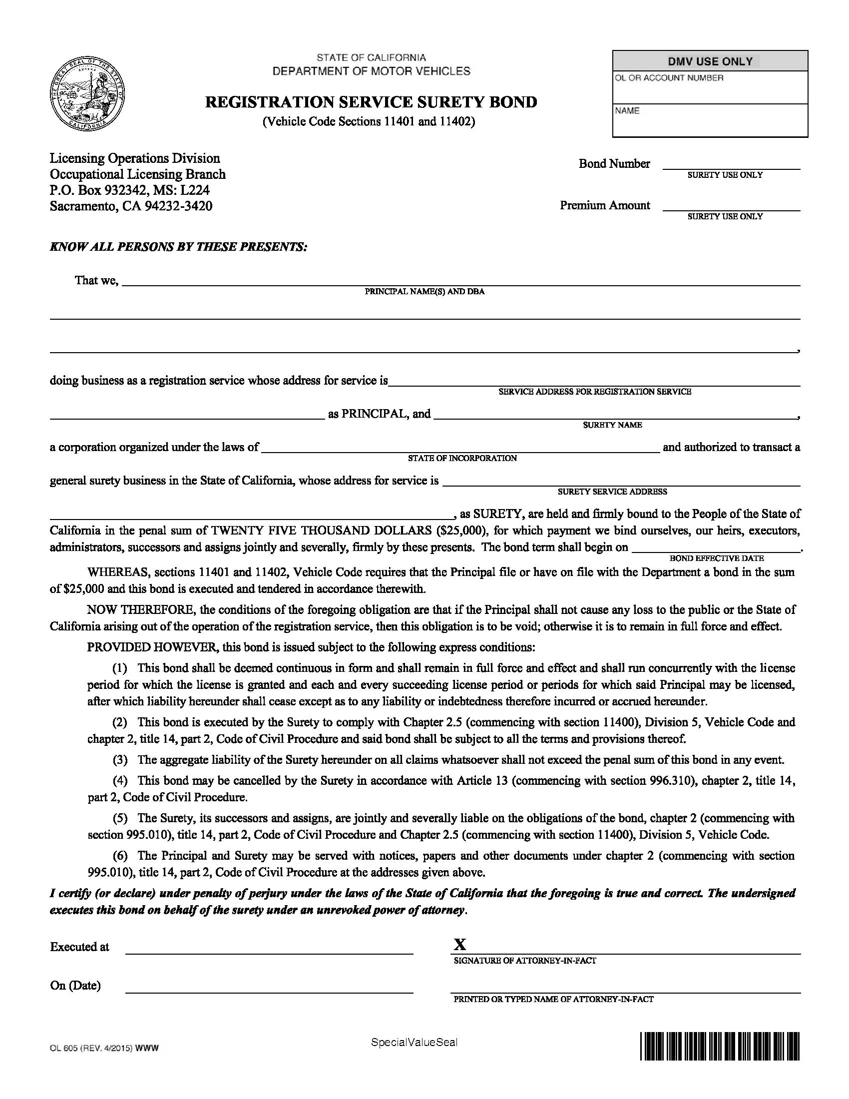 Any person or business that wants to obtain their vehicle registration service license must get a bond as part of the licensing process. According to the California Vehicle Code Section 505.2, the act of registration includes anyone who receives compensation to process registration documents, conduct lien sales, or process vehicle dismantling documents.