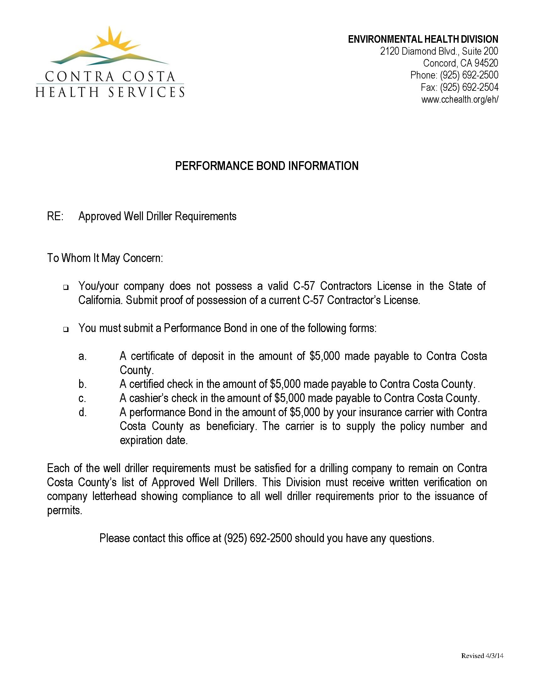 The California Contra Costa Health Services Water Well Driller Bond starts at $100 plus shipping costs and fees. Fill out the form to buy your bond instantly!