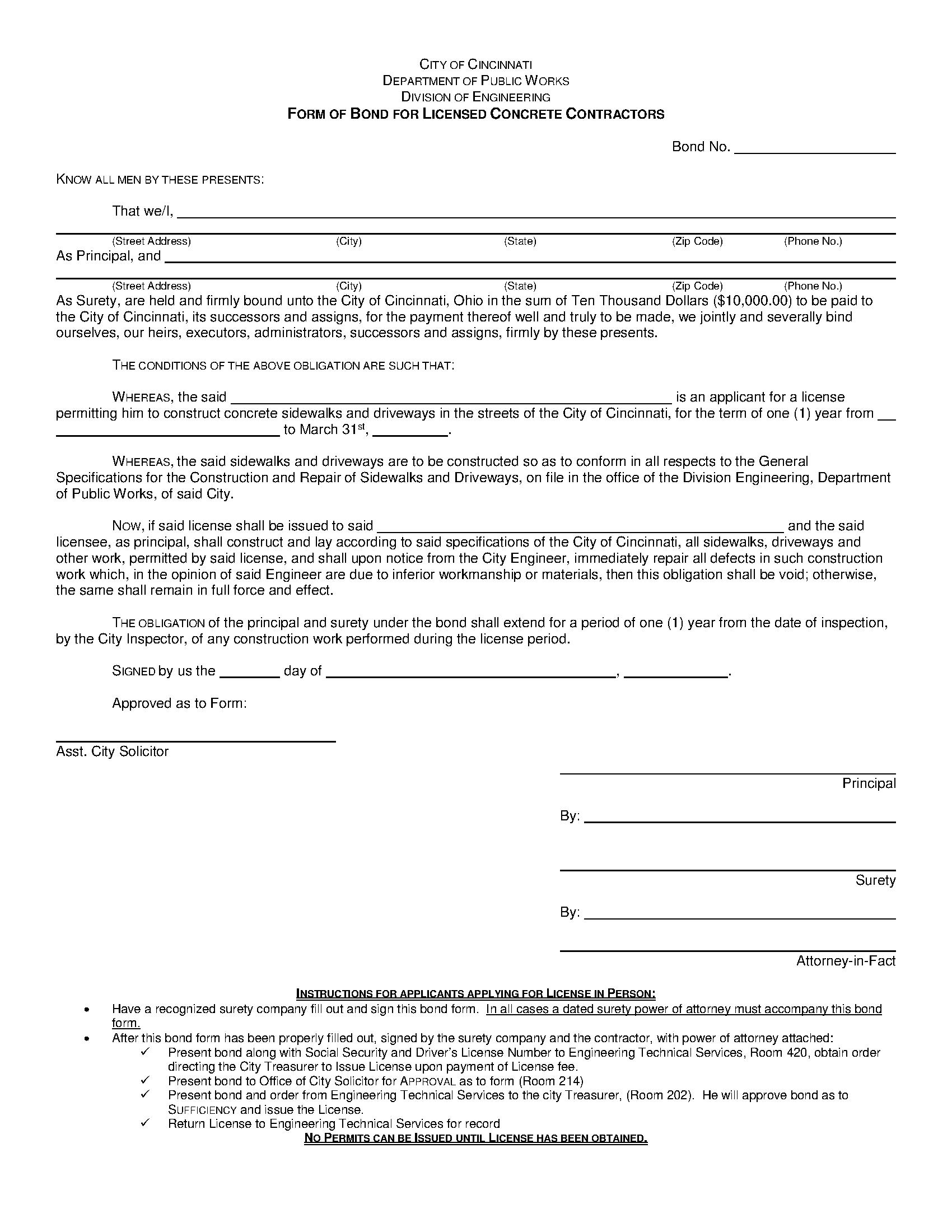 City of Cincinnati Concrete Contractor Bond