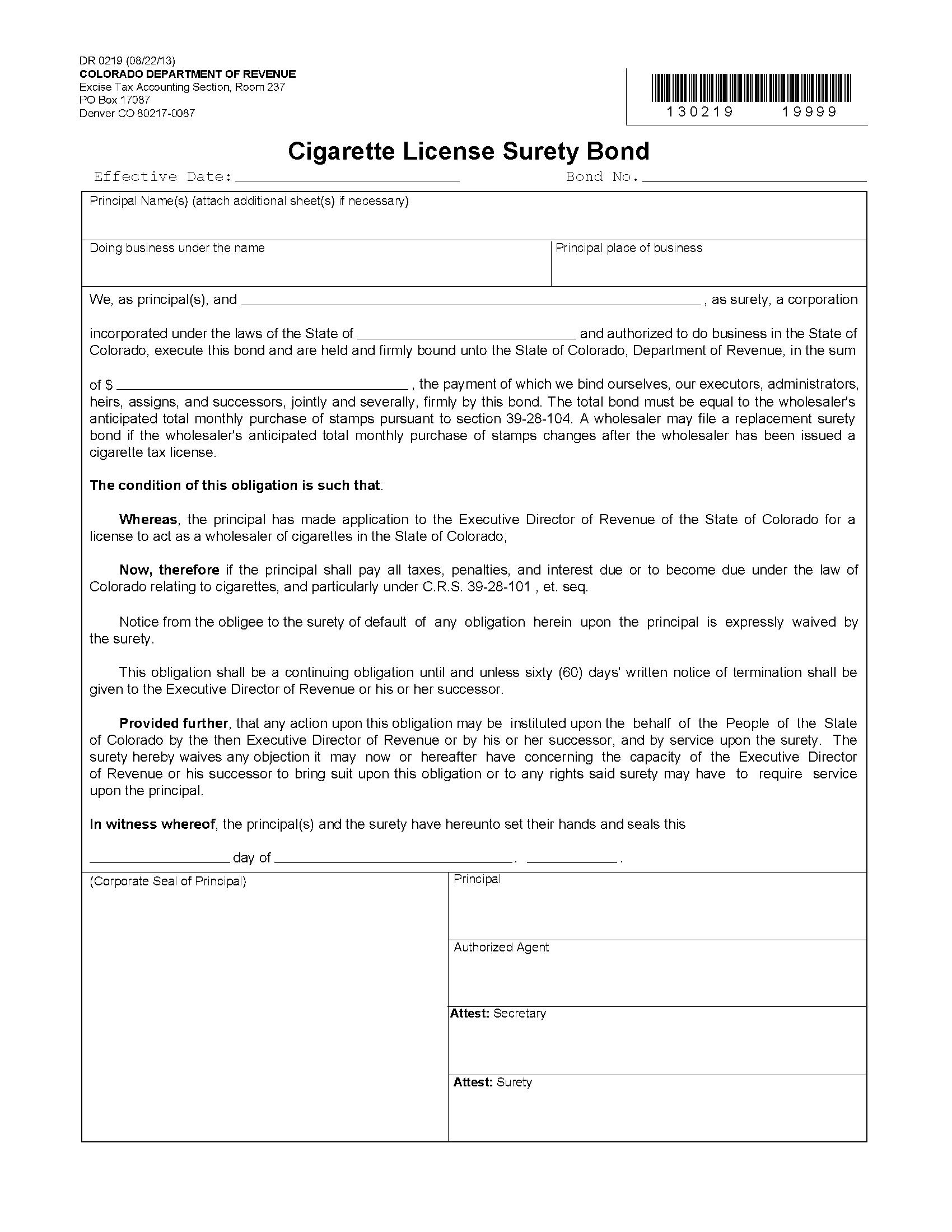 State of Colorado Wholesaler Cigarette License Bond