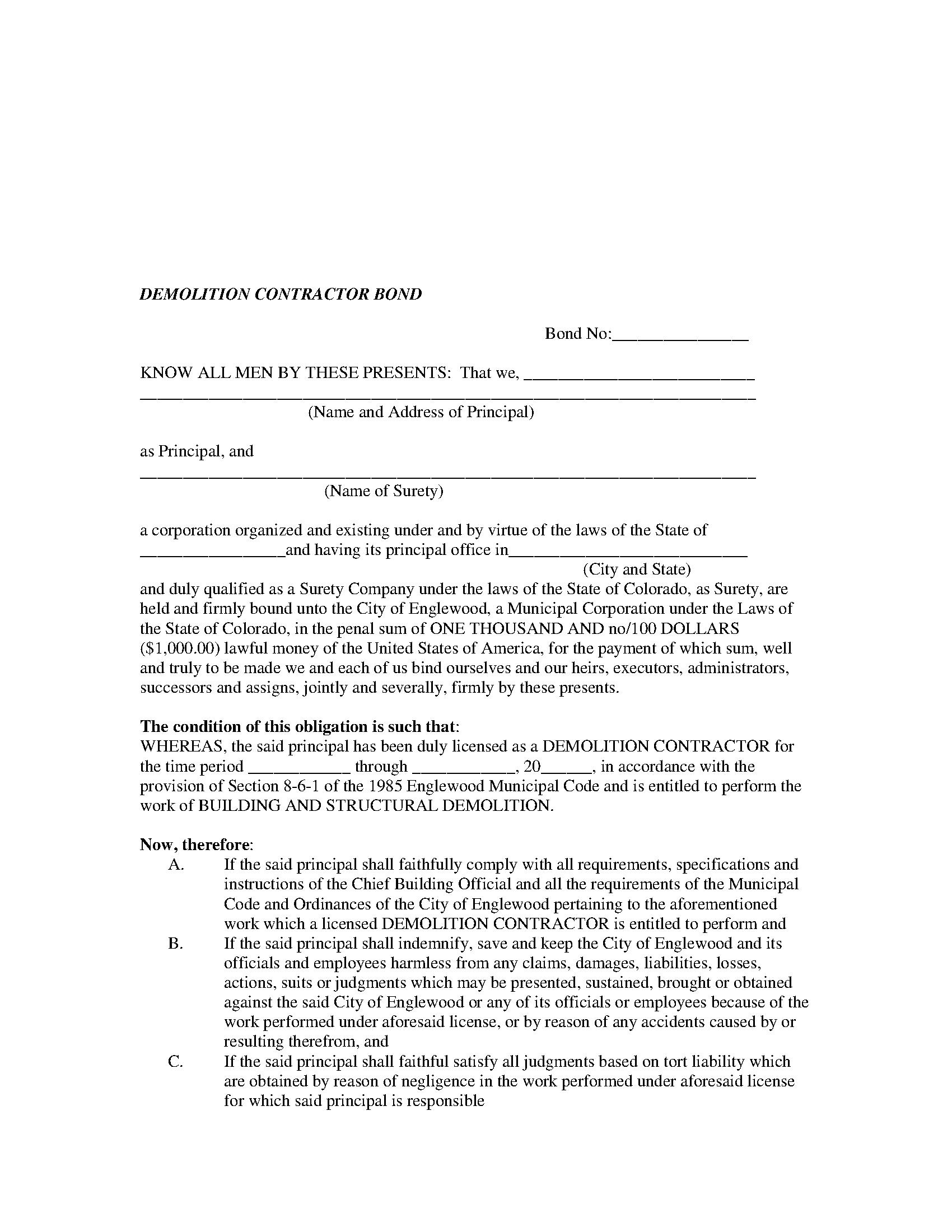 City of Englewood Demolition Contractor Bond