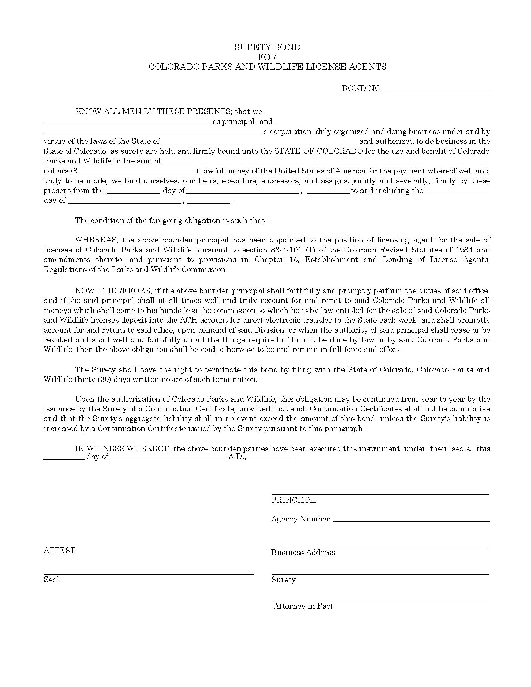 The Colorado State of Colorado Wildlife License Agent Bond starts at $100 plus shipping costs and fees. Fill out the form to buy your bond instantly!