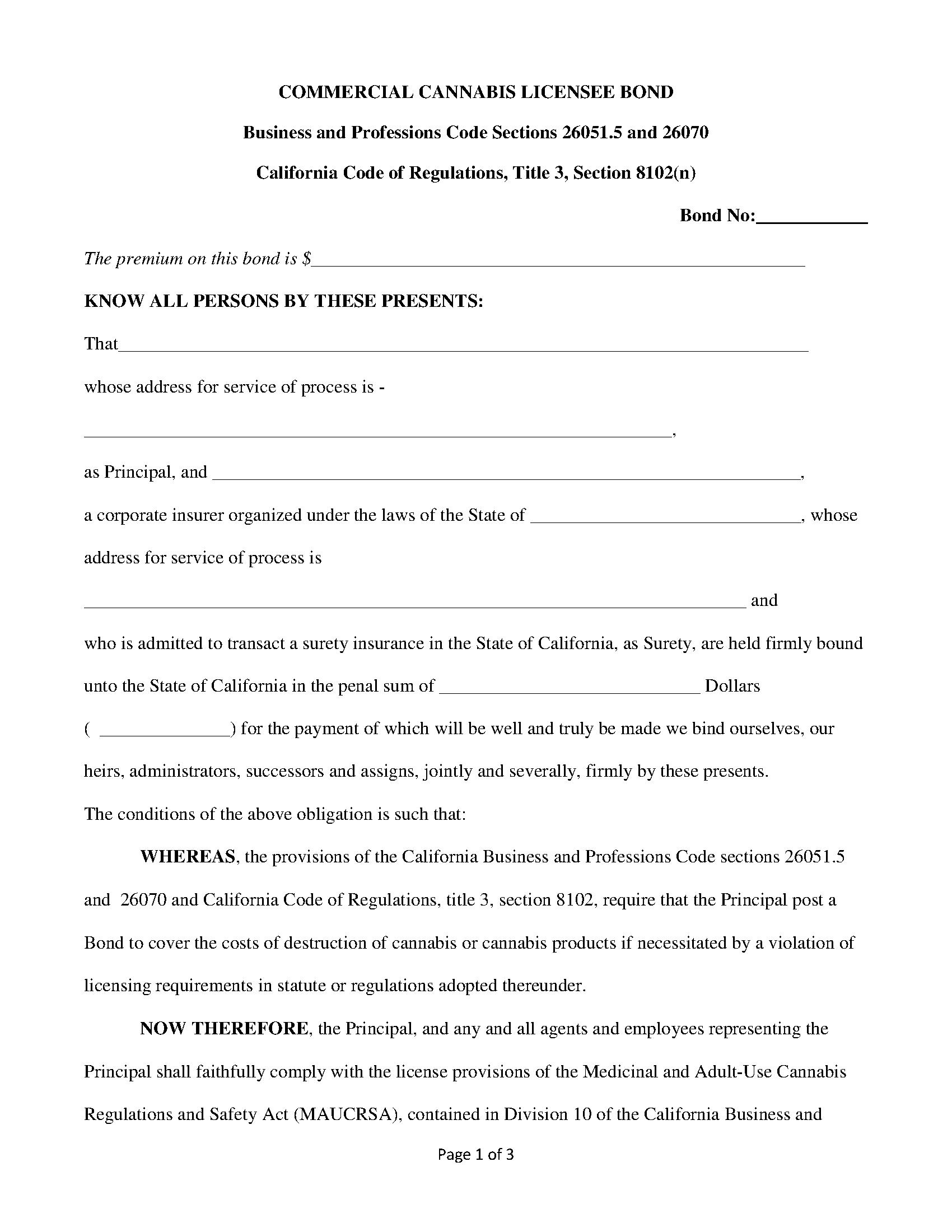 State of California Commercial Cannabis Licensee (Cultivation) Bond
