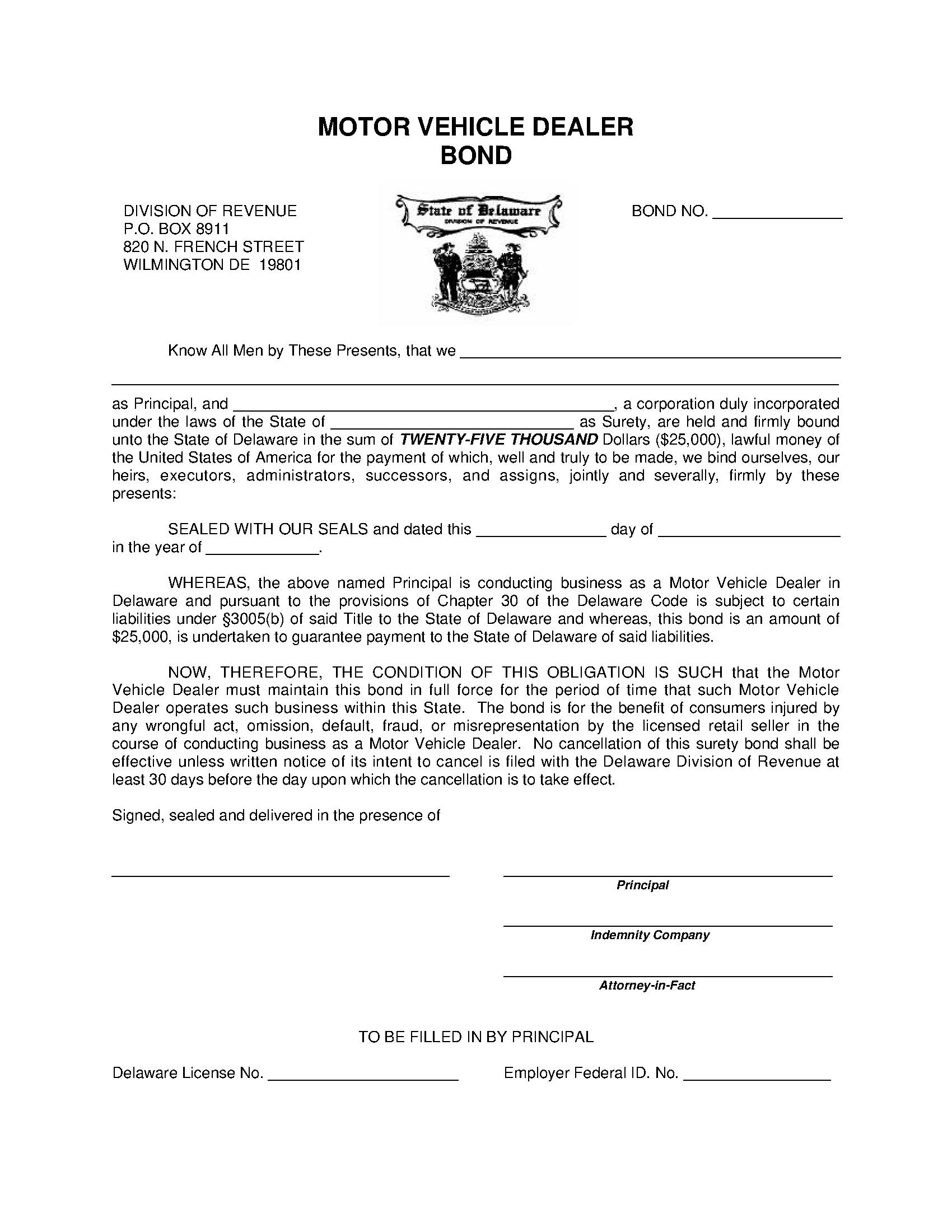 The Delaware Motor Vehicle Dealer Bond starts at $250 plus shipping costs and fees. Fill out the form to buy your bond instantly!