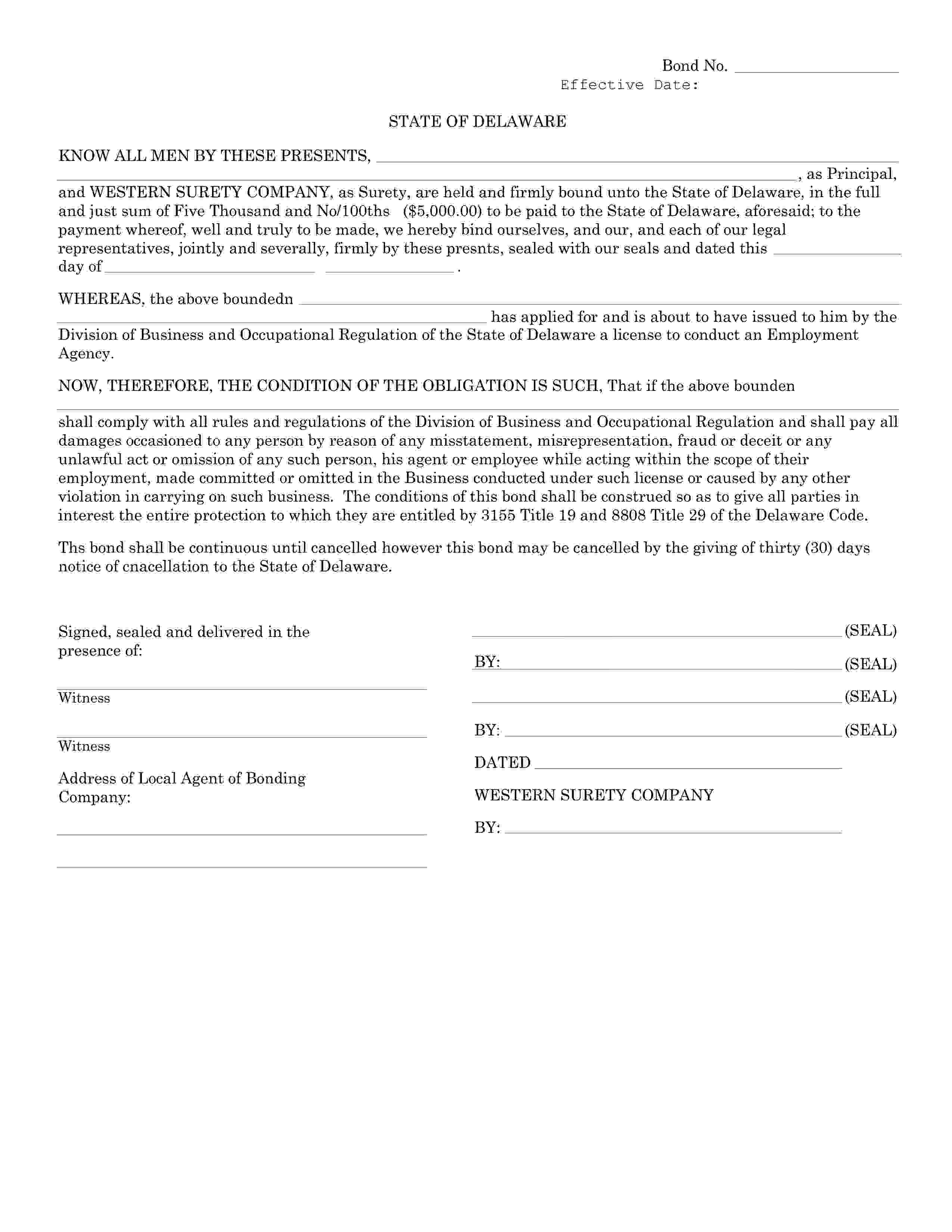 The Delaware Employment Agency Bond starts at $100 plus shipping costs and fees. Fill out the form to buy your bond instantly!