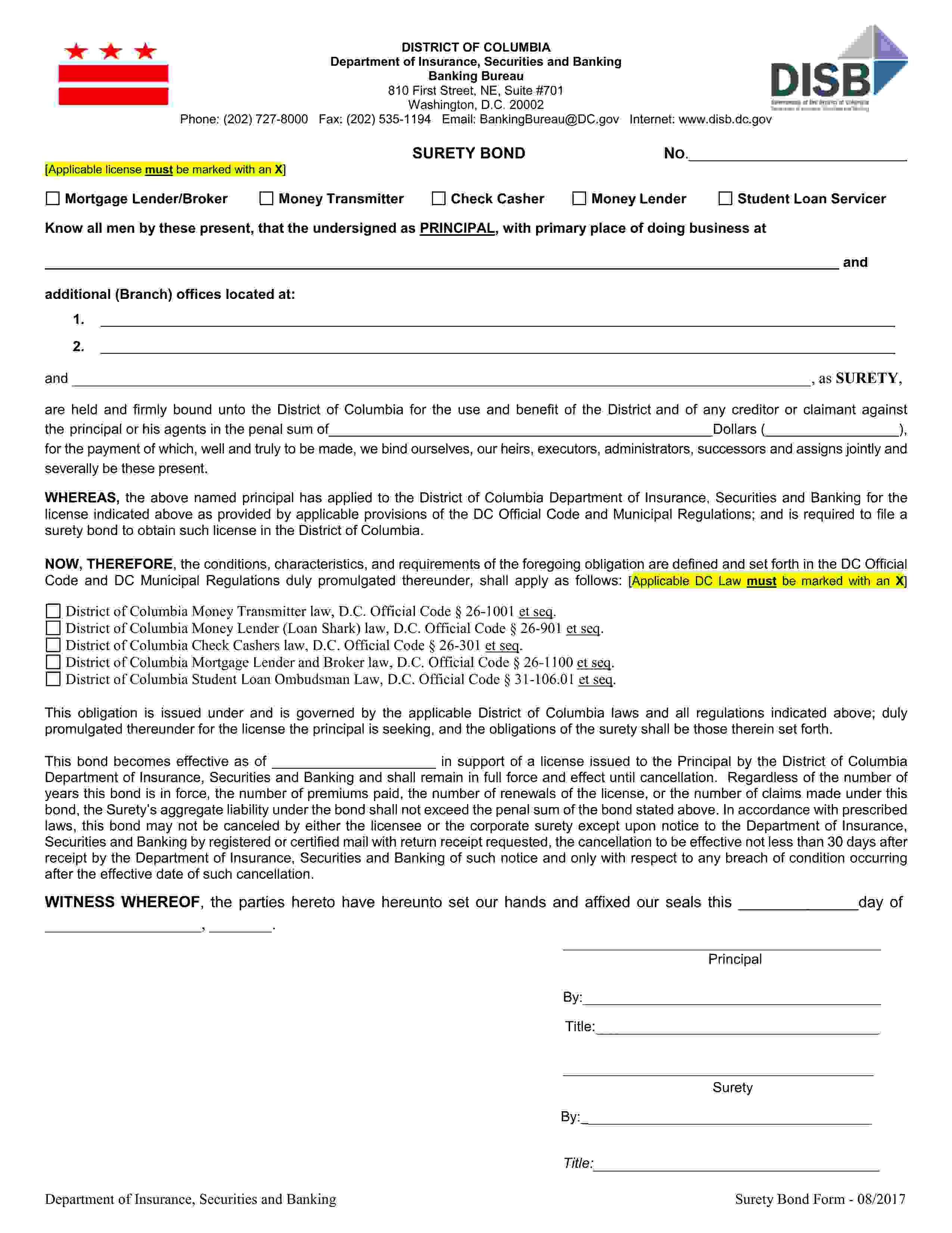 District of Columbia Check Casher License Bond