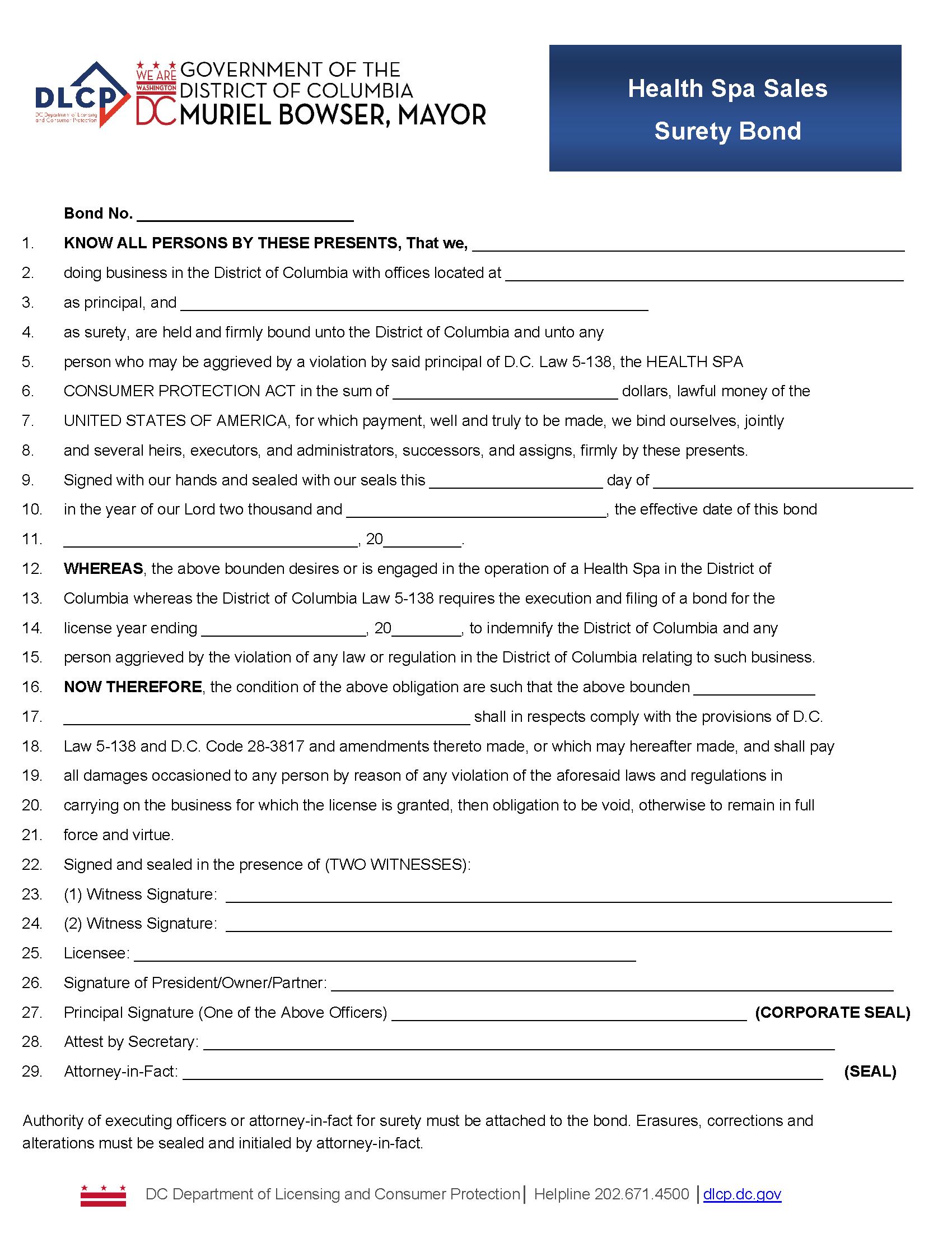 The District Of Columbia Health Spa Bond starts at $250 plus shipping costs and fees. Fill out the form to buy your bond instantly!