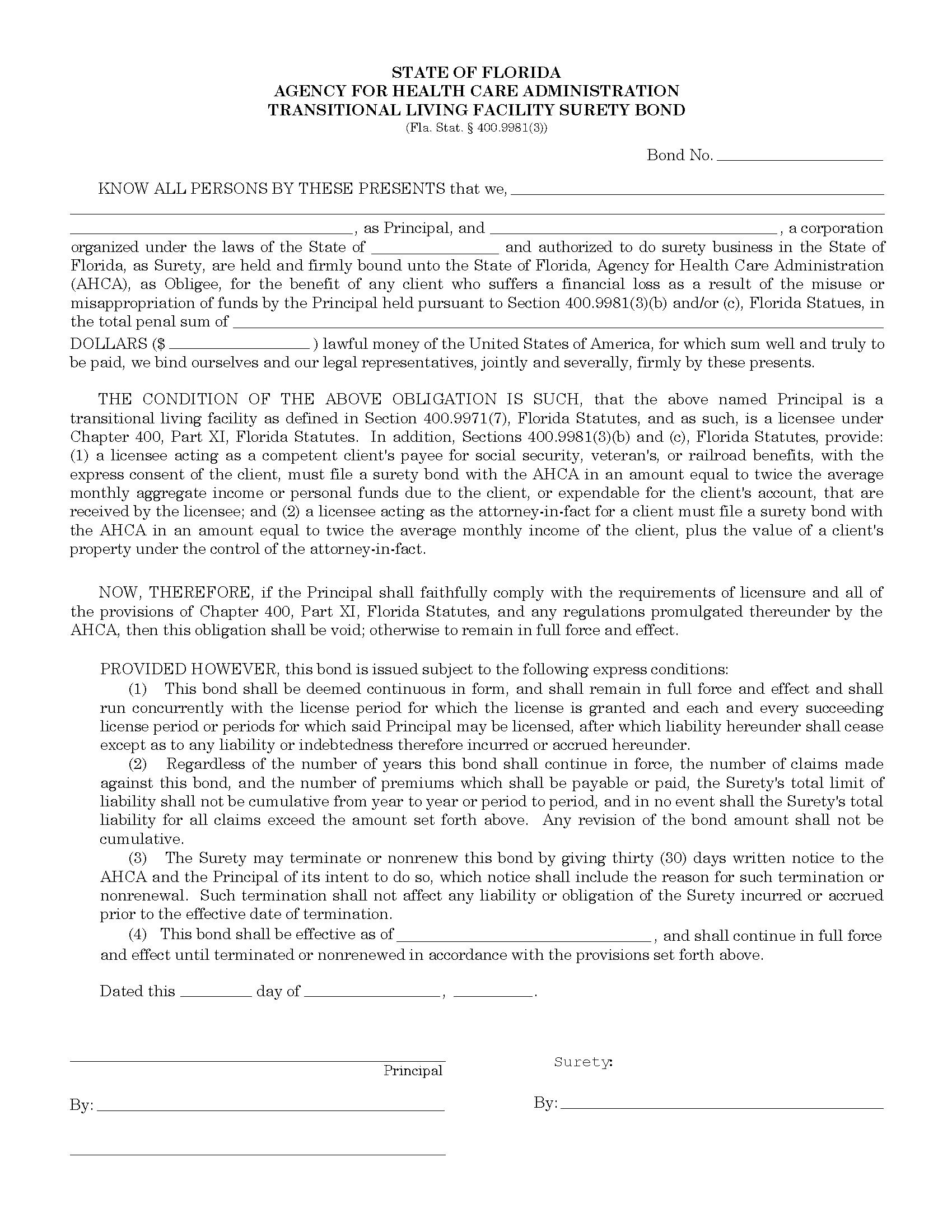 The Florida Assisted Living Facility Bond starts at $100 plus shipping costs and fees. Fill out the form to buy your bond instantly!