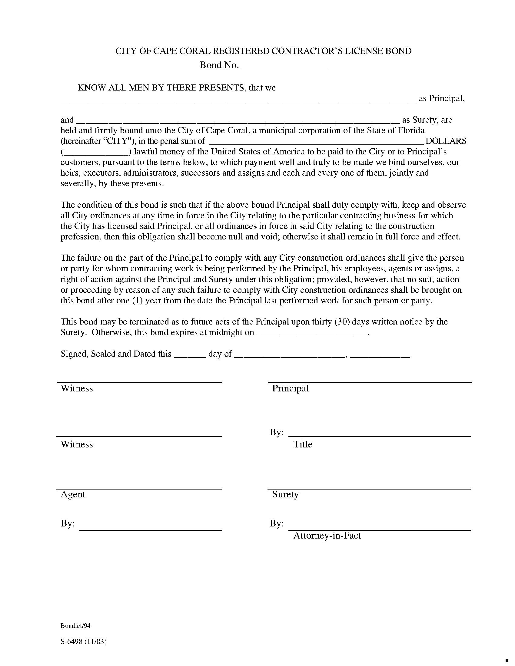 The Florida City Of Cape Coral Cape Coral - City Registered Contractors License Bond starts at $250 plus shipping costs and fees. Fill out the form to buy your bond instantly!