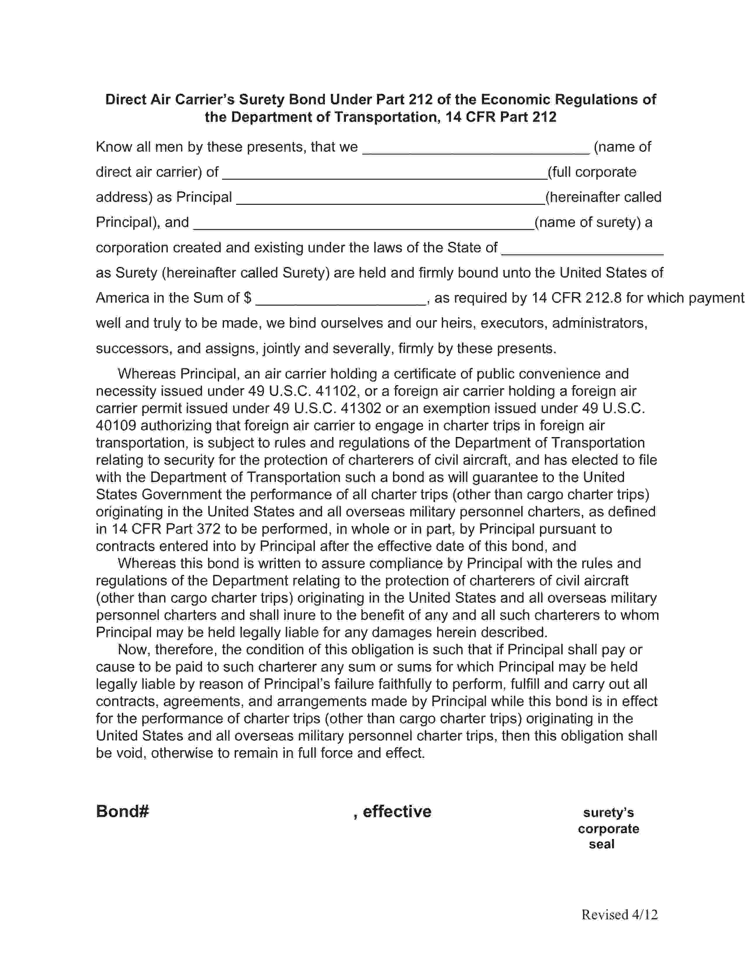 Special Authorities Division, X-46, Office of International Aviation, US Department of Transportation Direct Air Carriers Bond