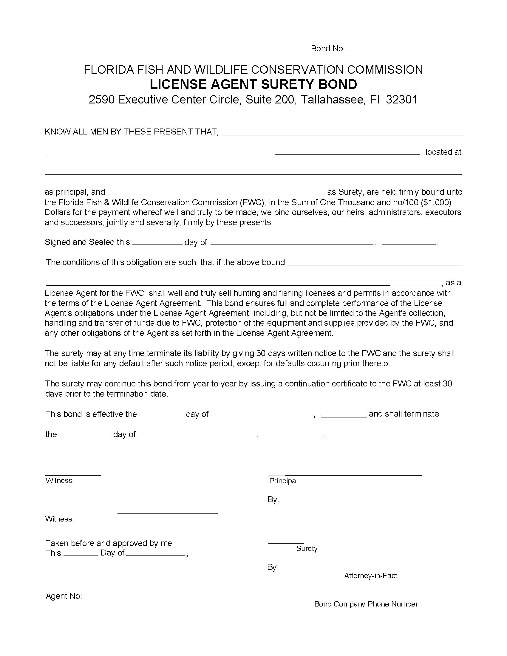 The Florida Hunting and Fishing License Agent Bond starts at $100 plus shipping costs and fees. Fill out the form to buy your bond instantly!