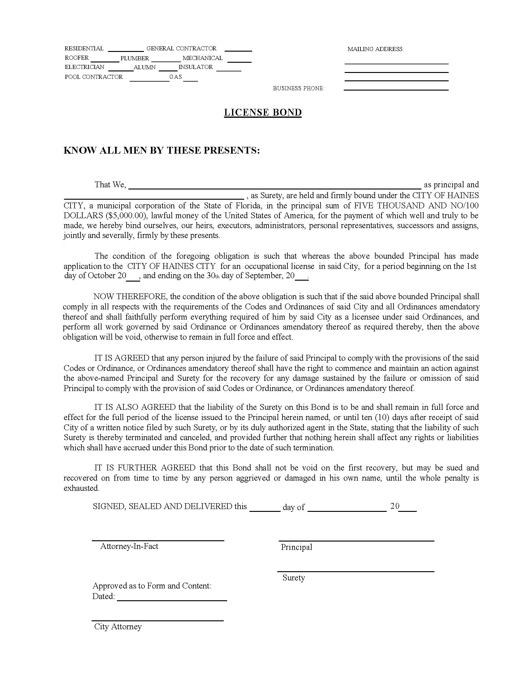 The Florida City of Haines Contractor All Trades Bond starts at $100 plus shipping costs and fees. Fill out the form to buy your bond instantly!