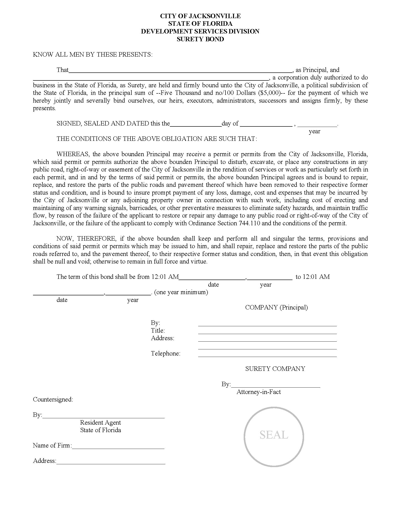 The Florida City of Jacksonville Right of Way Permit Bond starts at $100 plus shipping costs and fees. Fill out the form to buy your bond instantly!