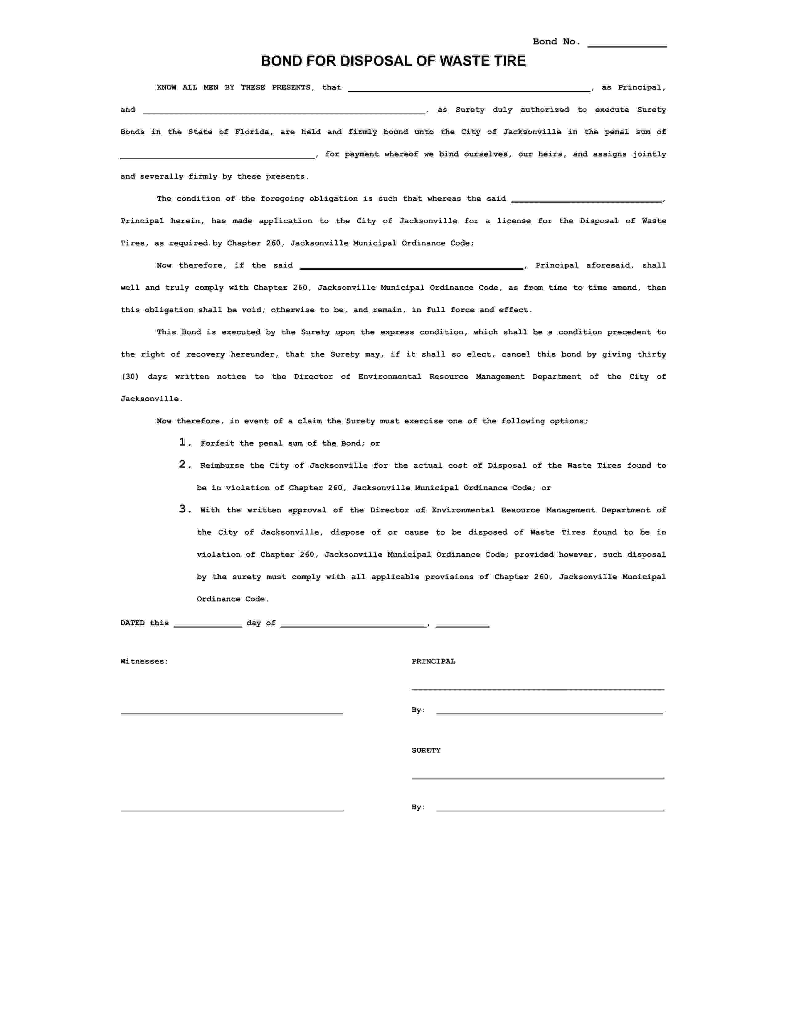 The Florida City Of Jacksonville, Department Of Public Works Jacksonville - City Disposal of Waste Tires Bond starts at $250 plus shipping costs and fees. Fill out the form to buy your bond instantly!