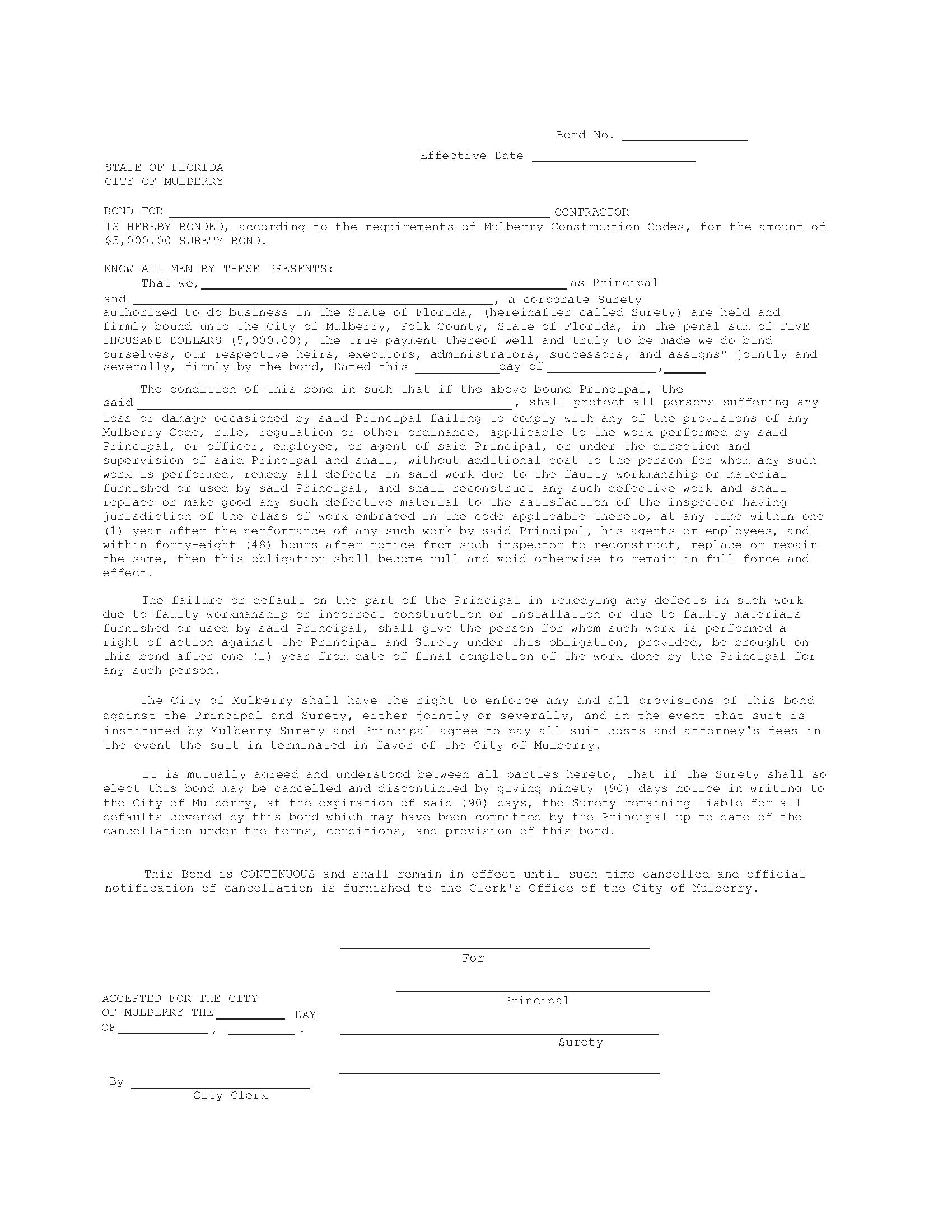 The Florida City of Mulberry Contractor License/Permit Bond starts at $100 plus shipping costs and fees. Fill out the form to buy your bond instantly!
