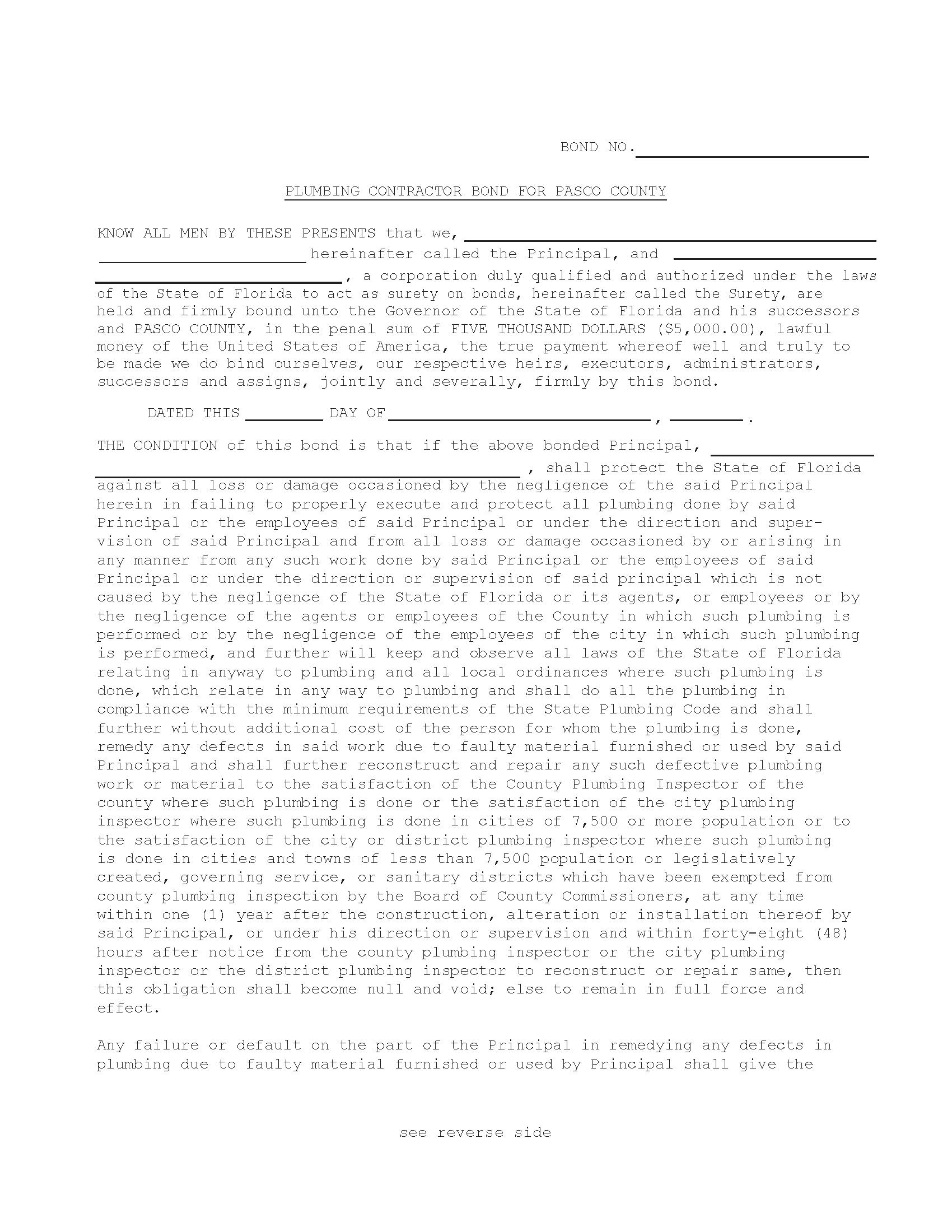 Pasco County Plumbing Contractor Bond