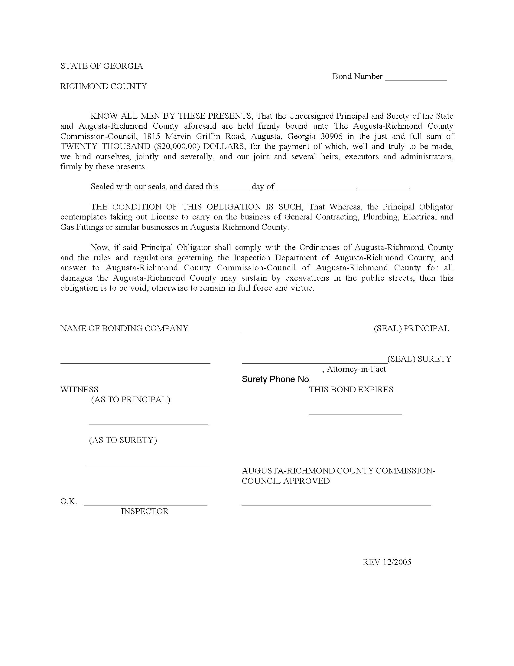 The City of Augusta, Richmond County Commercial Contractor Bond