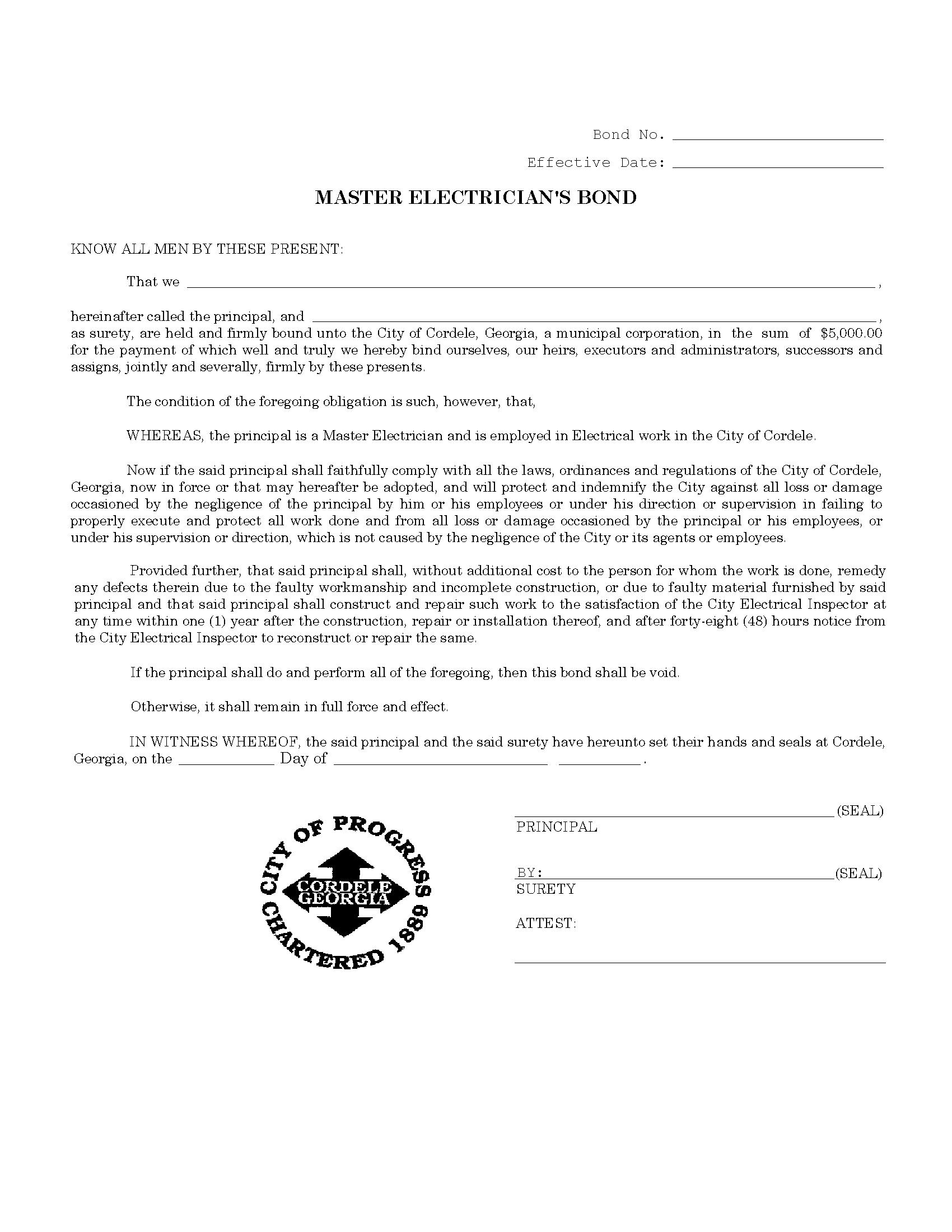The Georgia City of Cordele Cordele - City Master Electrician Bond starts at $100 plus shipping costs and fees. Fill out the form to buy your bond instantly!