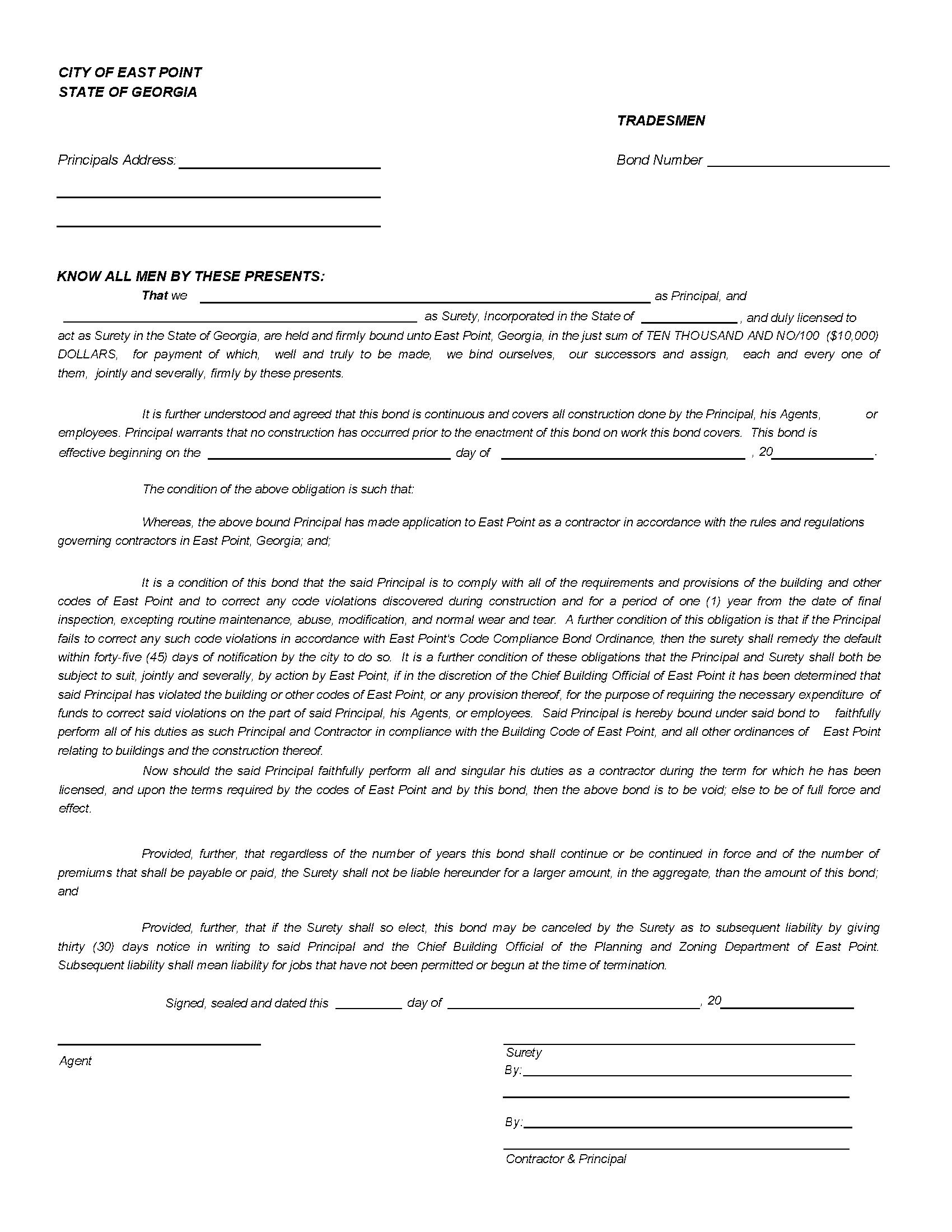 The Georgia City of East Point Tradesmen Bond starts at $100 plus shipping costs and fees. Fill out the form to buy your bond instantly!