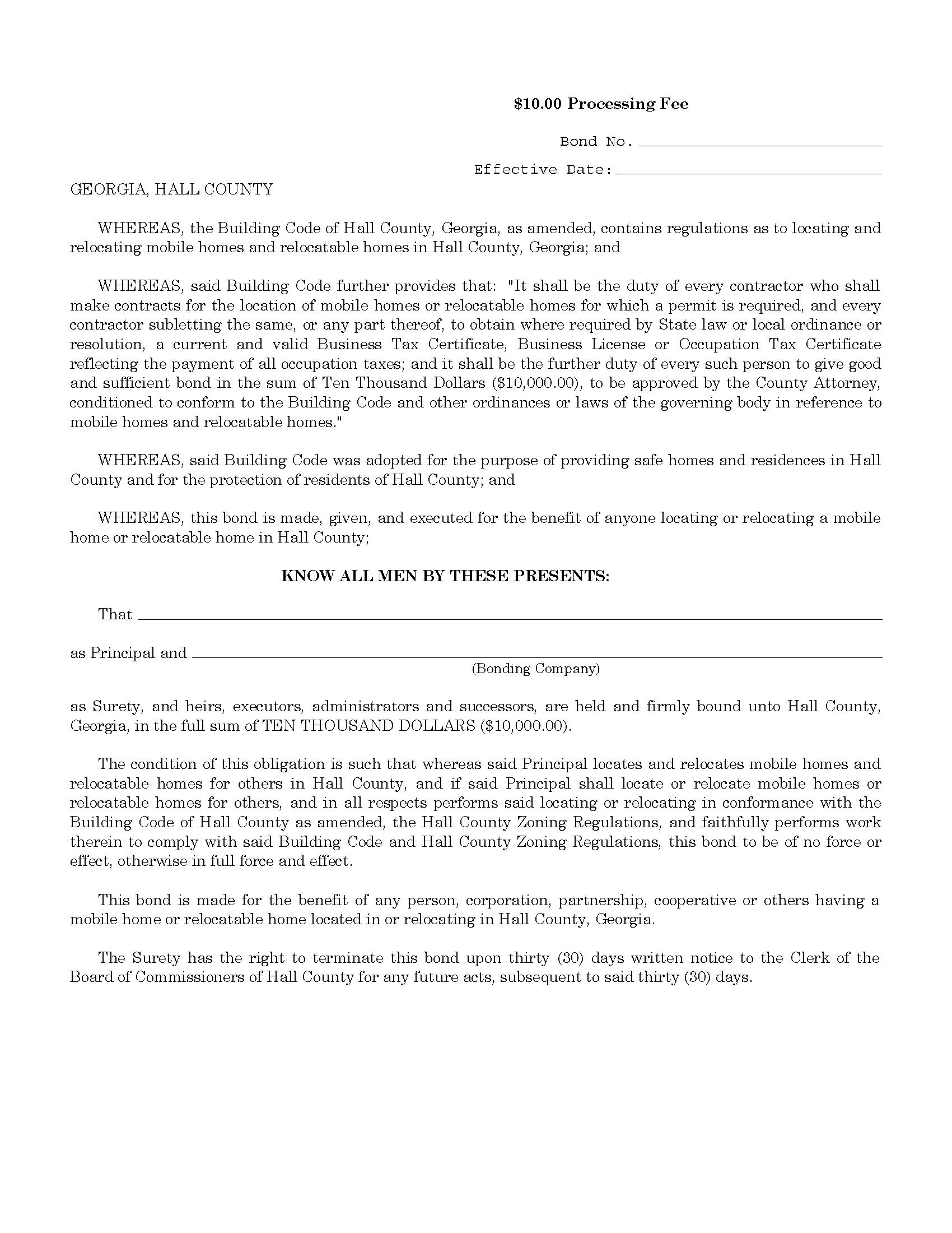 Hall County Mobile Home Locating and Relocating Contractor Bond