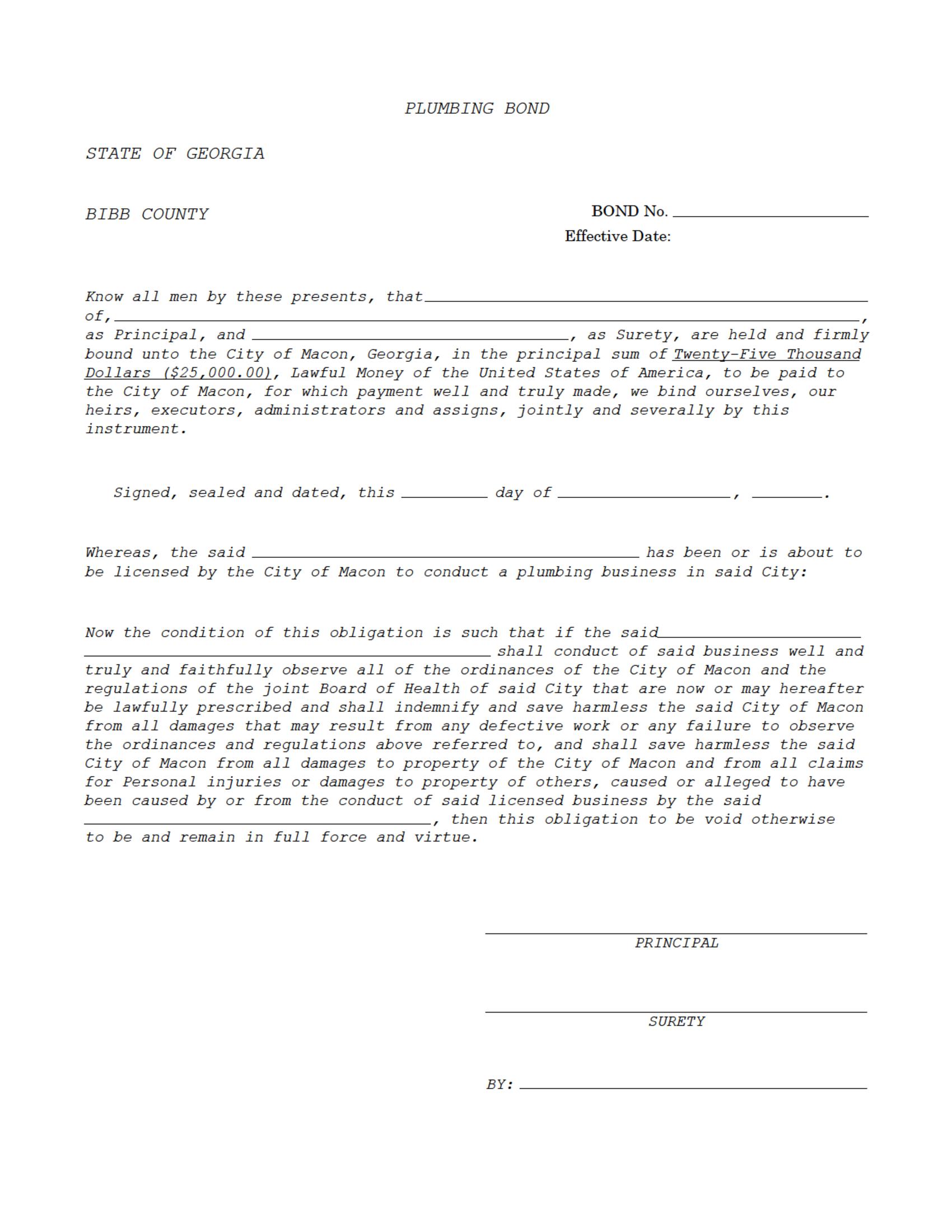 The Georgia City of Macon Macon - City Plumbing Bond starts at $250 plus shipping costs and fees. Fill out the form to buy your bond instantly!