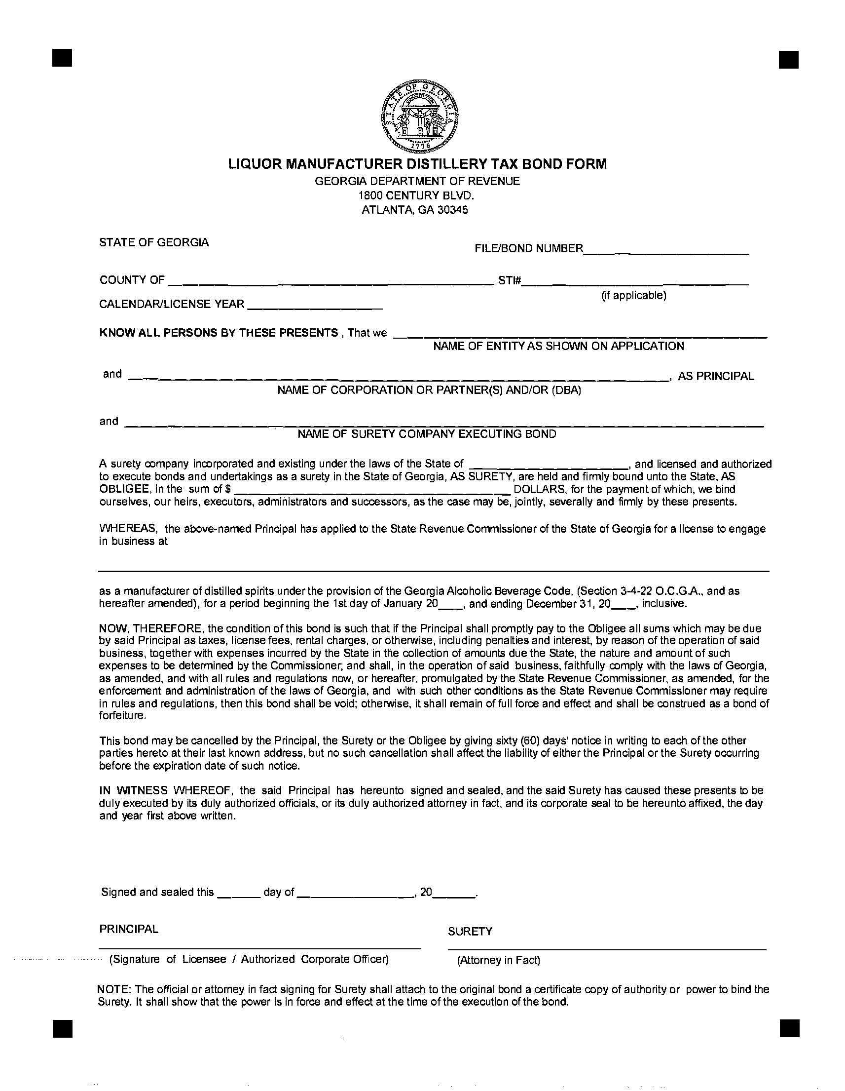 State of Georgia Liquor Manufacturer Distillery Tax Bond