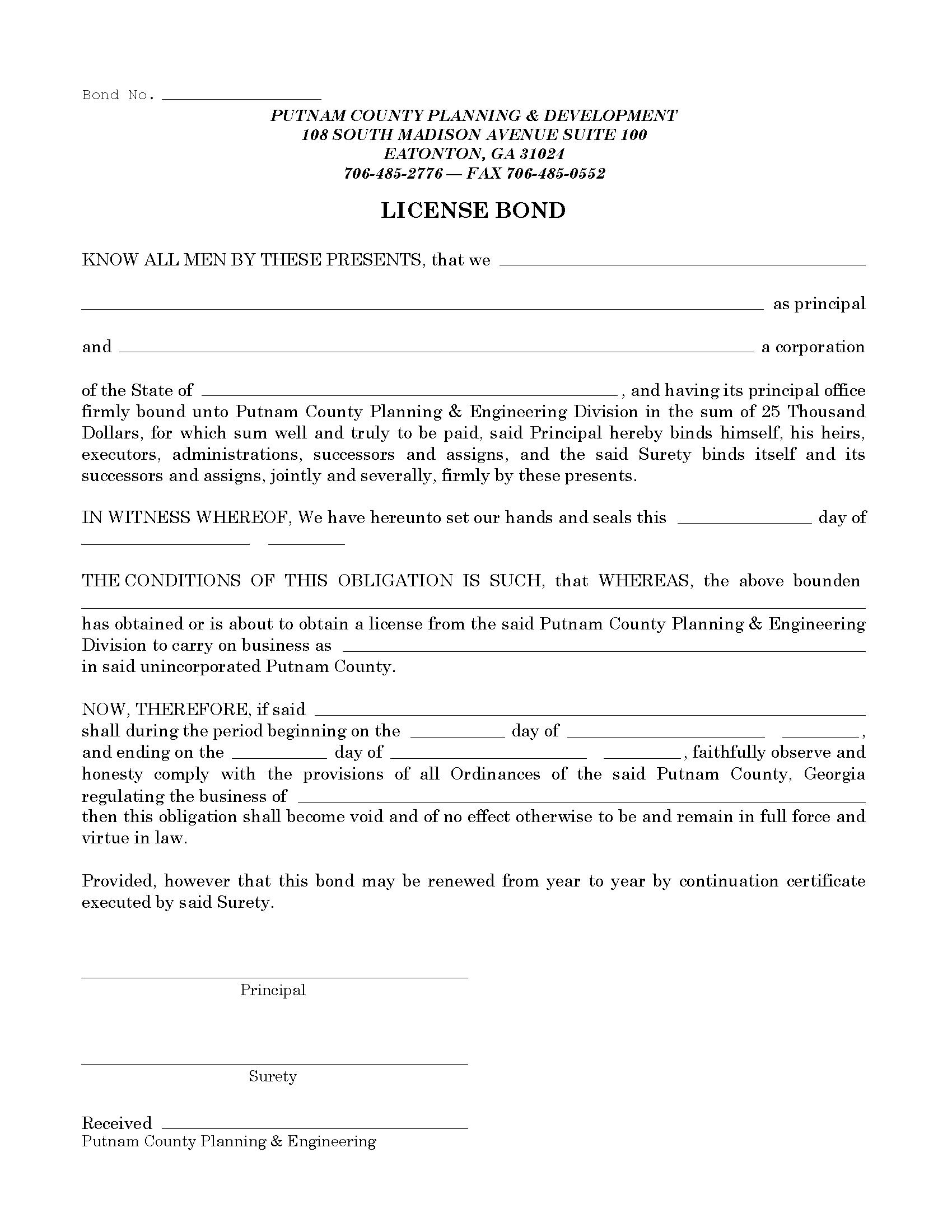 The Georgia Putnam County Planning and Engineering Division Putnam - County Contractor's License Bond starts at $250 plus shipping costs and fees. Fill out the form to buy your bond instantly!