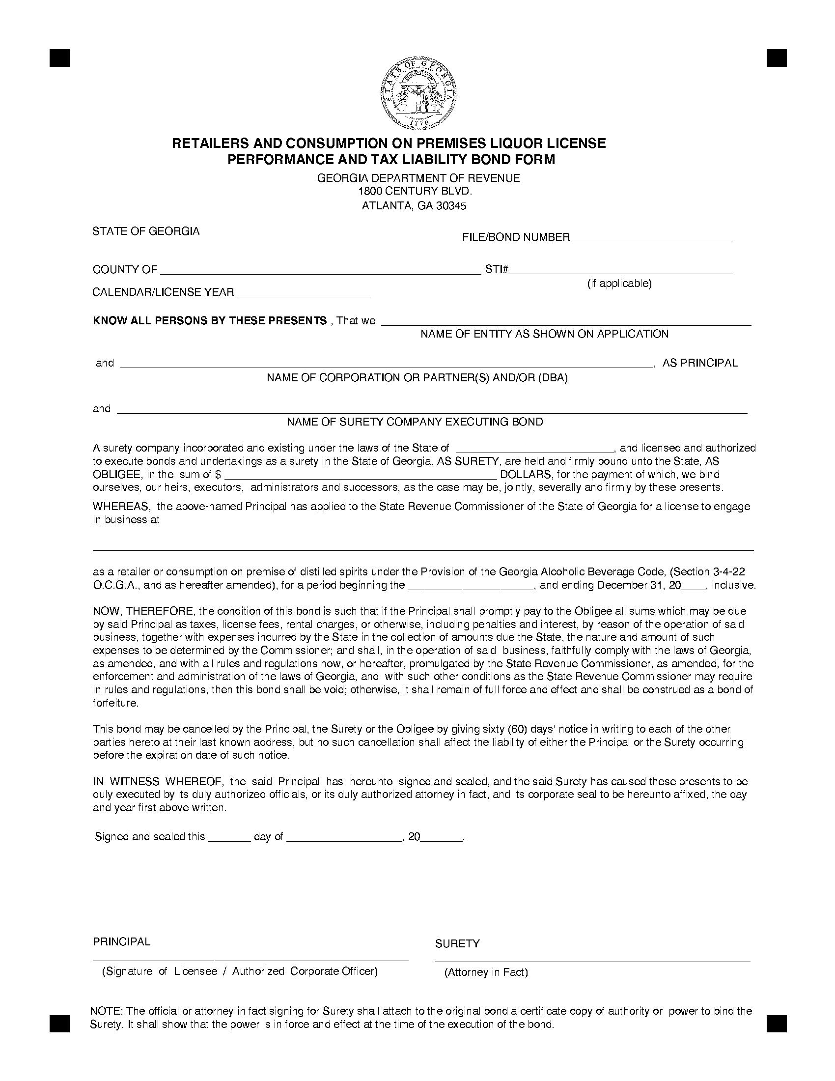 State of Georgia Retailers and Consumption on Premises Liquor License Bond