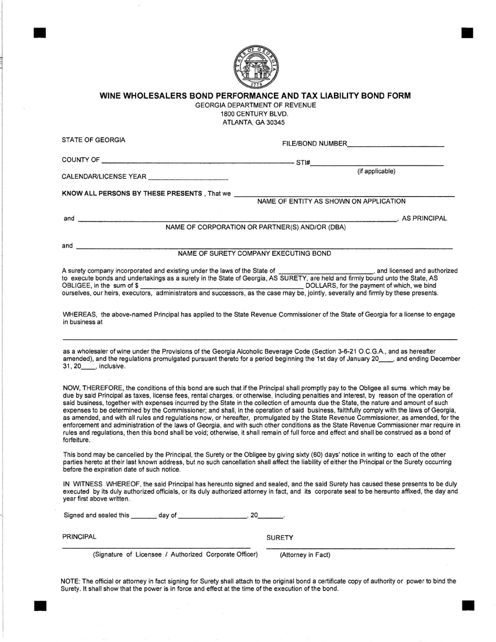The Georgia Wholesalers Wine Bond starts at $100 plus shipping costs and fees. Fill out the form to buy your bond instantly!