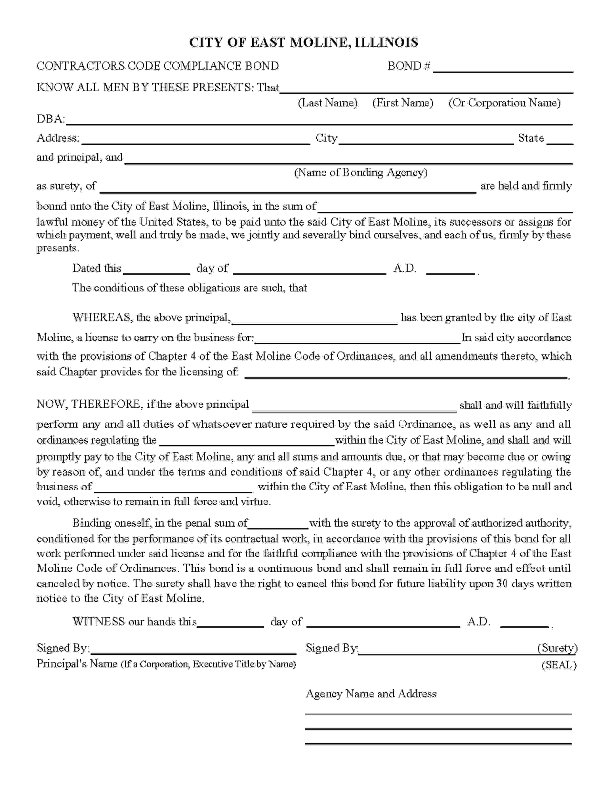 City of East Moline Contractors Code Compliance Bond